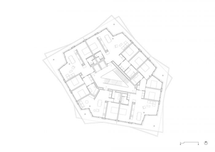 以此类推,每套公寓都被设计成一个内部景观,生活区宽敞地围绕着设置在规划四角的木廊。特别注意的是走道阳台形式的外部延伸,使居民能够循环使用并占据外部空间。在拐角处,阳台上的褶皱从一层交替到另一层,大大增强了阳台的使用价值和日照率,有助于创造一个有机的、好玩的合奏感知。