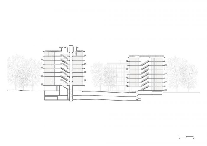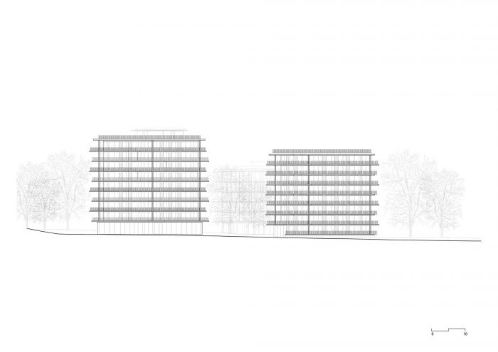 The project proposes a contemporary interpretation of the garden city, combining a human, landscape-oriented scale with the notion of density and rationality. Three structured towers of varying heights are set in the center of a large garden. Through this strategy, the project presents an organic volumetric response to the park.