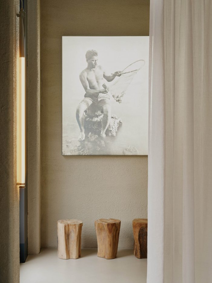 一张1907年拍摄的夏威夷渔民的照片起到了榜样的作用,为这个概念提供了灵感。一个男人坐在岩石上,身上只穿了非常必要的一点衣服,正在准备他的装备,准备出去打猎。我们欣赏这种情况下的亲密感、平衡感和诚实感。