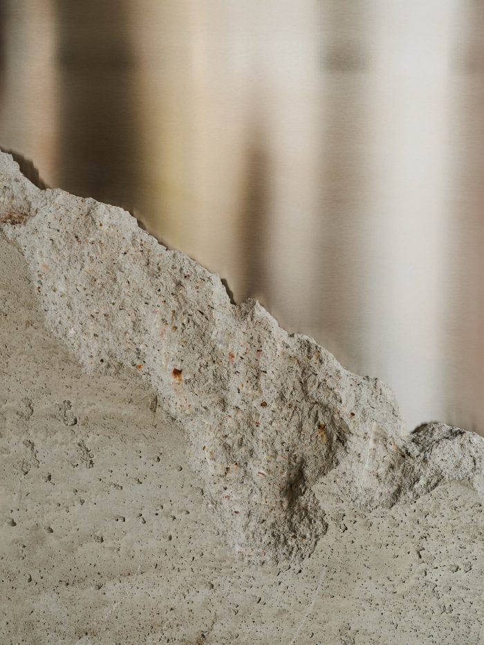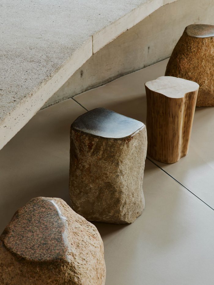 The guest room transports the idea of an intimate and meaningful experience. Two curvy concrete tables that complement each other capture the room's center attention. Inspired by the fisherman, cut-off granite stones from Norway and wooden stumps present the possibility to take a seat. The table has a rough yet pleasant surface and gives the idea of a terrazzo structure. Boulders of different colorways add a natural and warm color palette to the interior.