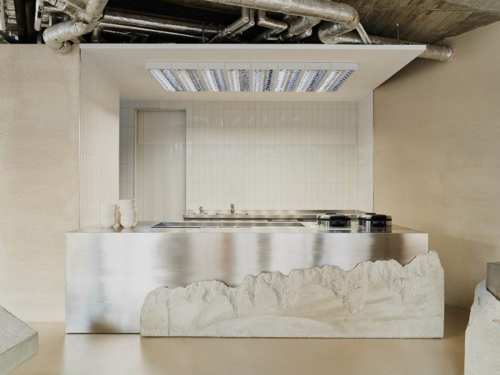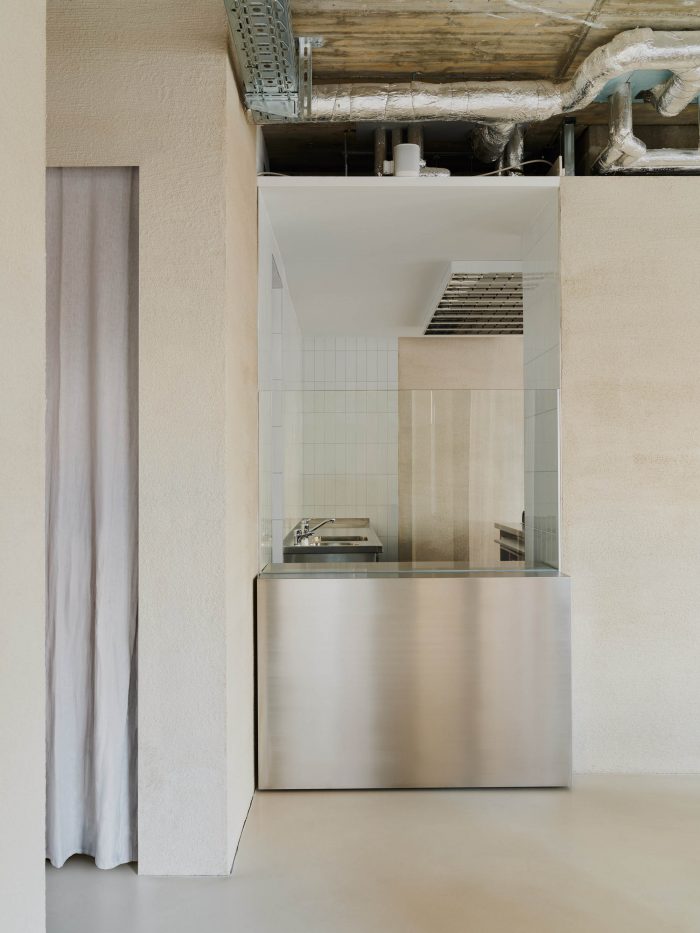一块石头,是餐厅企业形象的一部分,在餐厅最显眼的地方,在窗口慢慢旋转。手工制作的具有粗糙纹理的混凝土应用与不锈钢厨房柜台并驾齐驱,后者通过一块大玻璃与客房隔开。