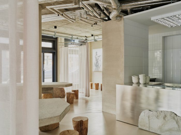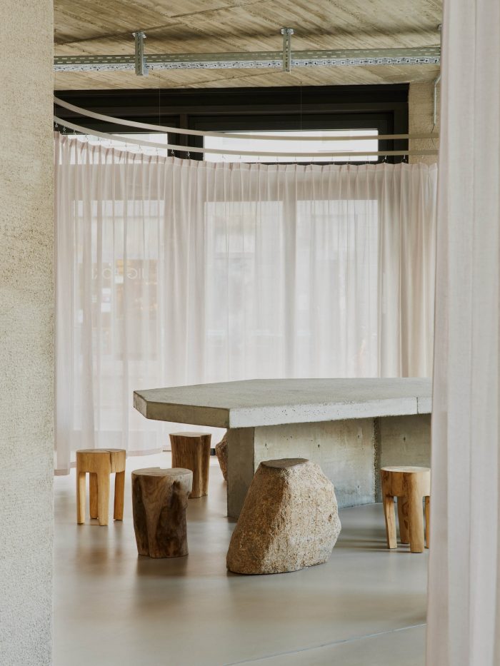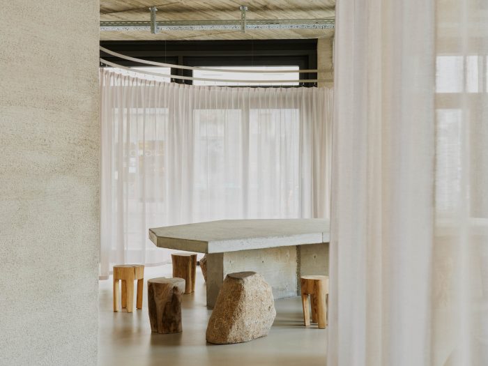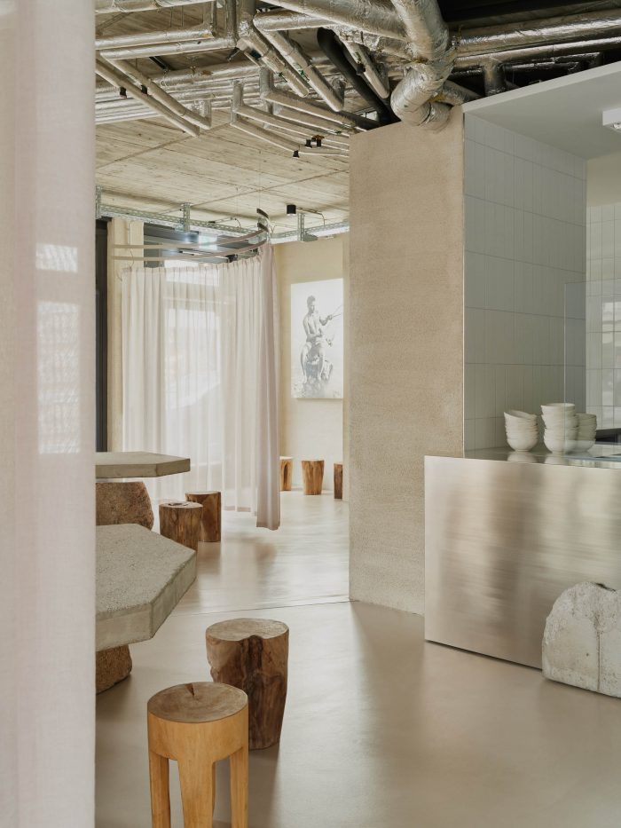 The floor and wall plastering pick up the warm tones and give a natural and earthy atmosphere. Linen curtains with a bespoke hanging system, made of aluminum, complete the seating situation gently.