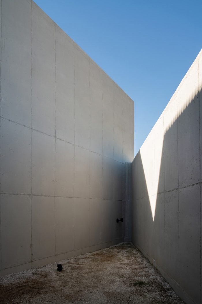 房子的位置是作为一个两层楼的屋檐混凝土体,位于被用作玉米田的郊区住宅景观中。房子的设计理念是通过空隙空间的过渡和通过鱼游等运动发生的凝视,使空间体验自由而不僵硬。与未完成的混凝土表面相连的体块的构成强调了从地面上牢固固定的重量和物质性,但考虑到周围的景观和太阳的方向,空间的扭曲和体块的移除揭示了空间的稳固性和动态性。