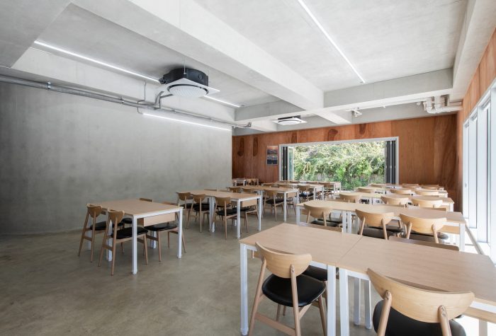 The first floor above ground is used as a restaurant, and the inner hall and kitchen form a dynamic boundary through the concrete mass and void space of the stairs and toilets. A plywood wall with patterns was used to contrast the exposed concrete ceiling, walls, and floors.