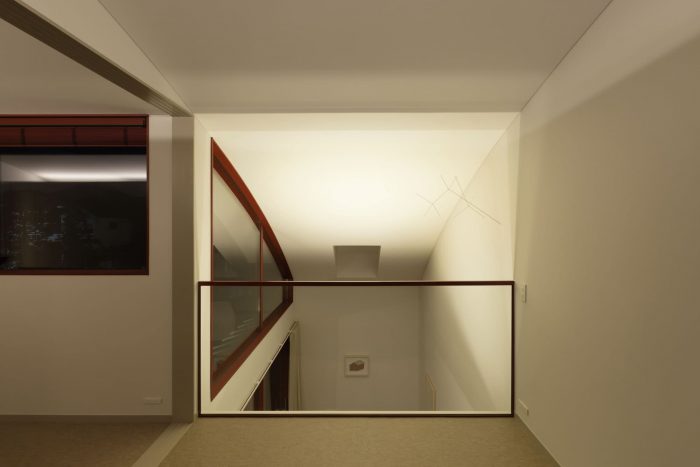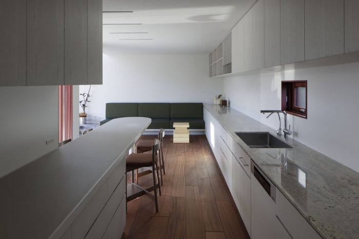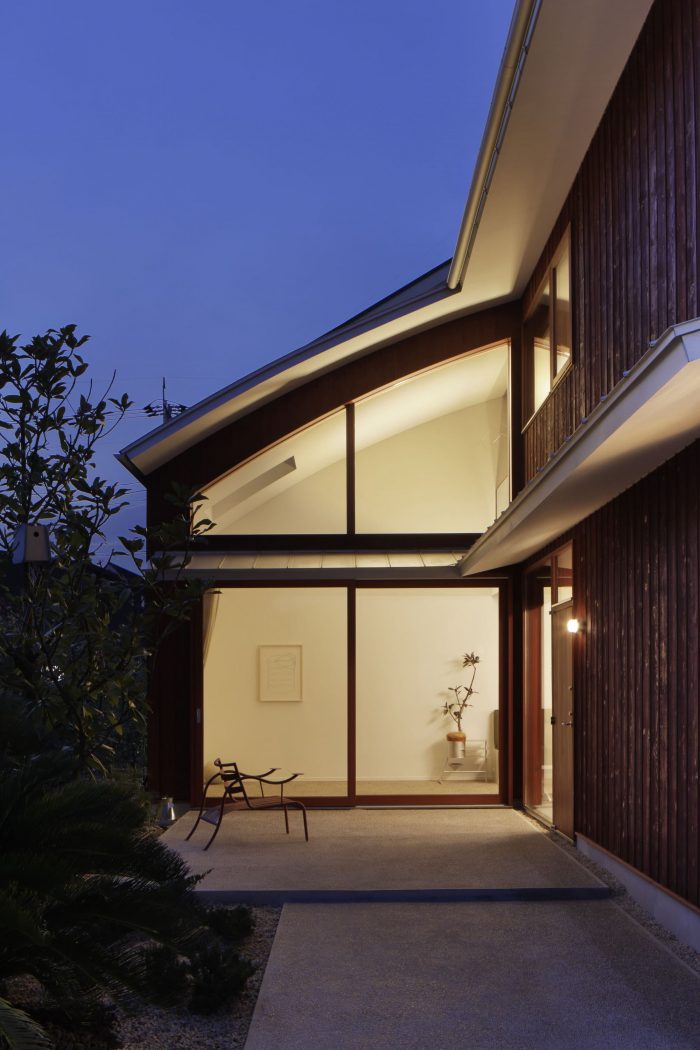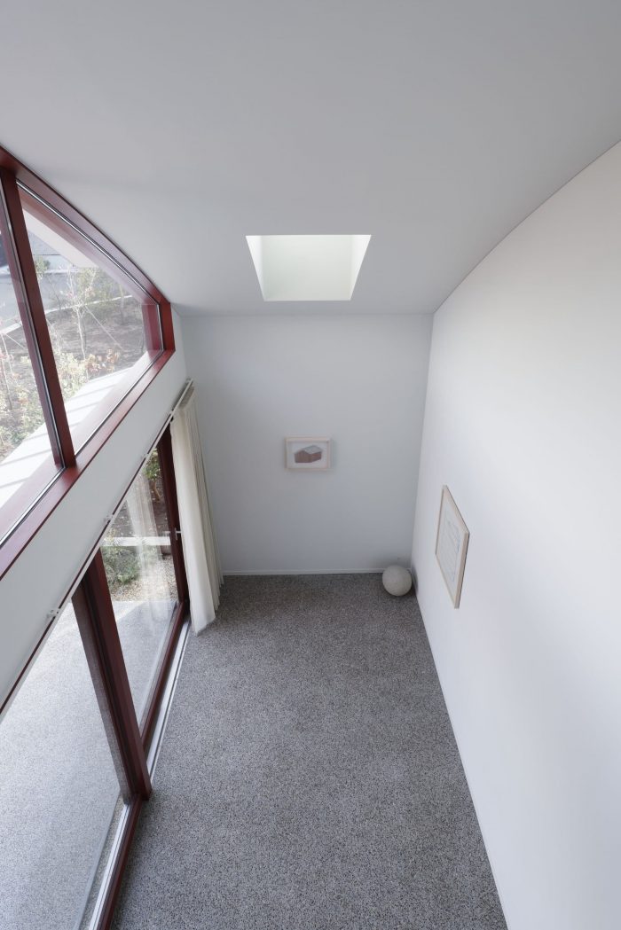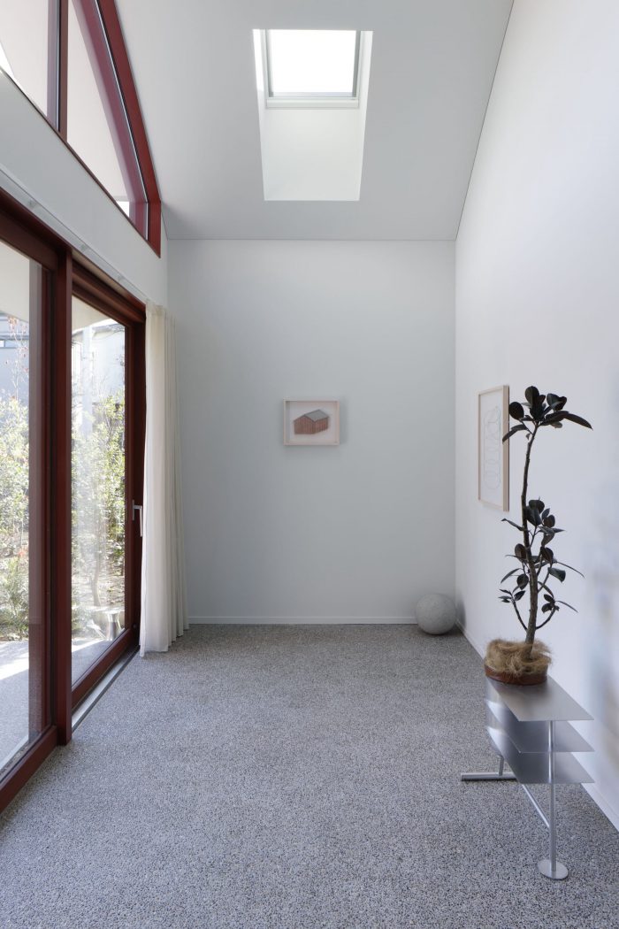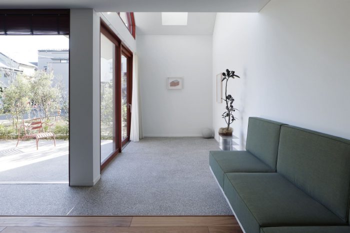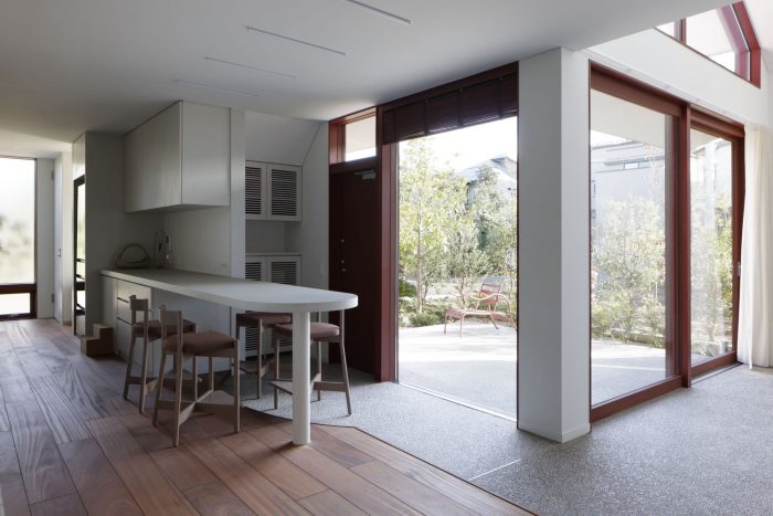 With the greenery at its side, the approach integrates with the terrace and leads continuously to a large earth floor with an atrium. The area from the entrance to the earth floor is finished with a reddish stone mixed with washed-out stone. This floor connects both the inside and the outside of the house, blurring the boundaries in a variety of situations.