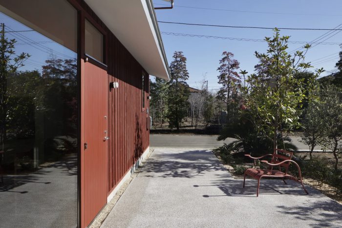 The most distinctive feature of the building is the deep red color of the "bengara" used for the exterior walls. Bengara is a highly weather-resistant pigment that has long been used as a paint for Japanese houses. Rather than using the same color as the surrounding area to blend in with the environment, we intended to use a contrasting color to strengthen the significance of the architecture in this location. The reddish-brown exterior walls were then combined with a silver roof and eaves made of galvalume steel sheet. Japanese tropical plants were planted in the exterior gutters to further strengthen the contrast with the surrounding greenery.