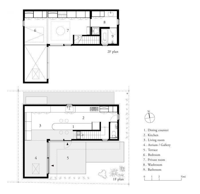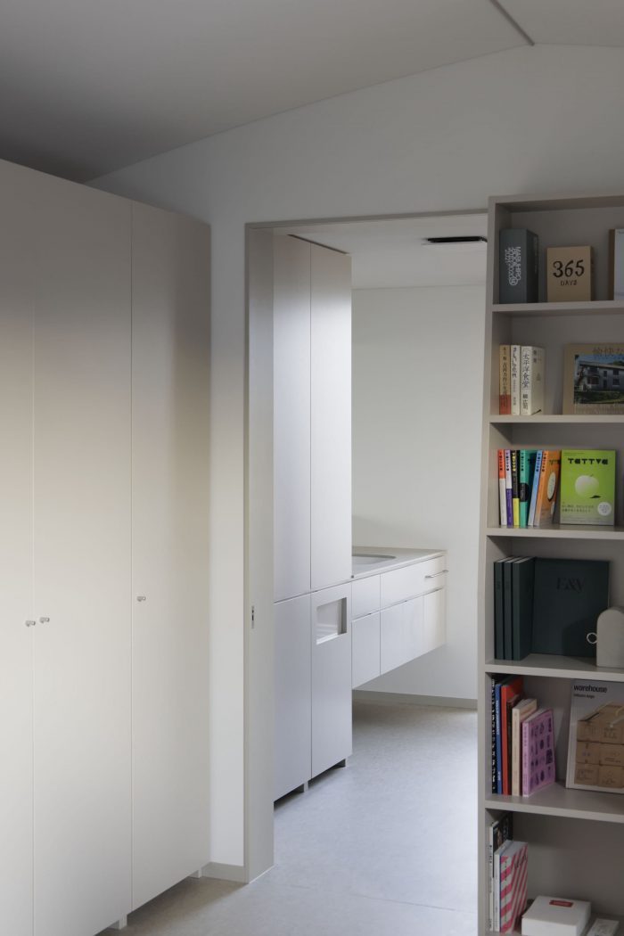 The ground floor, for example, normally functions as a living and dining room but becomes a semi-public exhibition space during events. The dining counter, which is set higher than usual, flexibly changes its role from being a display stand for exhibitions to a serving counter for standing meals in conjunction with the kitchen. In addition, furniture such as counters and sofas were placed at the boundary between the earthen floor and the wooden flooring, so that people can use them without taking off their shoes. The house is further characterized by the fact that it was designed to support a wide variety of situations.
