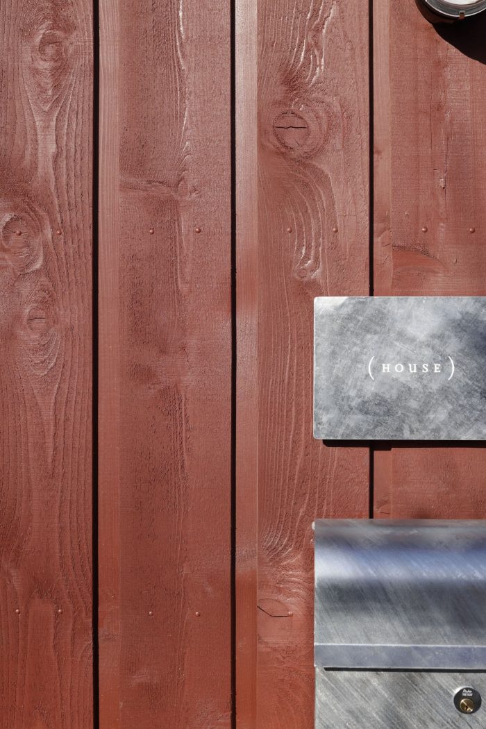 该建筑最显著的特点是外墙使用的 "Bengara "的深红色。Bengara是一种高度耐候的颜料,长期以来一直被用作日本房屋的涂料。我们没有使用与周围地区相同的颜色来融入环境,而是打算使用一种对比强烈的颜色来加强这个地方的建筑的意义。然后,红褐色的外墙与银色的屋顶和镀锌钢板制成的屋檐相结合。日本的热带植物被种植在外部排水沟中,以进一步加强与周围绿色植物的对比。