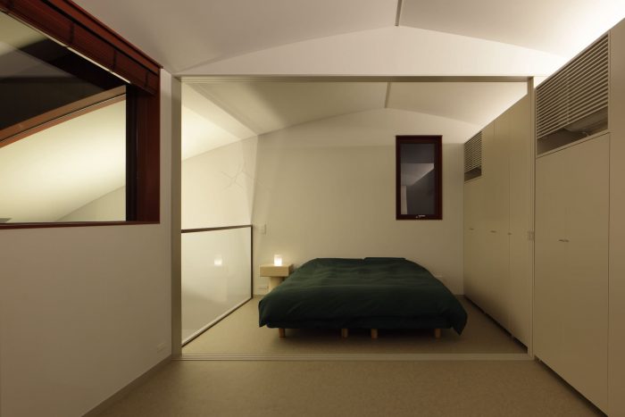 The ceiling of the earthen floor, which is a vaulted ceiling, is the place where the broad arc expression of the ”mukuri roof” is most apparent. The residents' private bedrooms on the second floor are again connected to this atrium, allowing their vision and also ventilation to circulate throughout the house. While the chairs on the first floor were designed to match the counter, a low table was originally created for the second floor, where a sense of calm was demanded. This contrasts with the first floor by emphasizing the nature of floor seating. By planning the surrounding environment, architecture, interior, and furniture in conjunction with the client's thoughts, we attempted to firmly define the house's way of being.