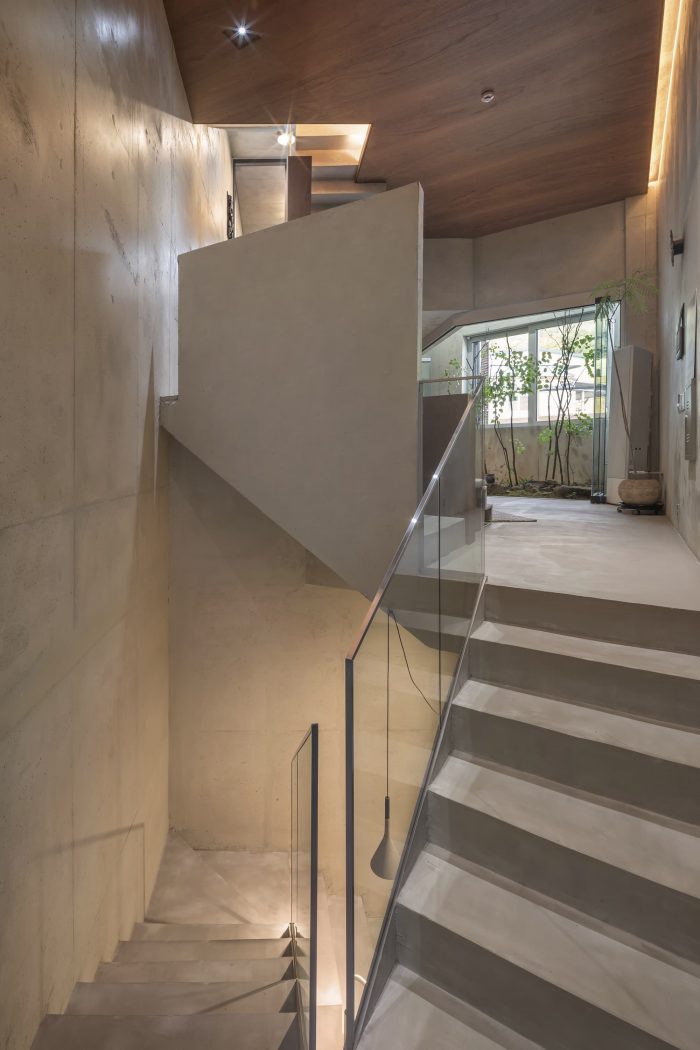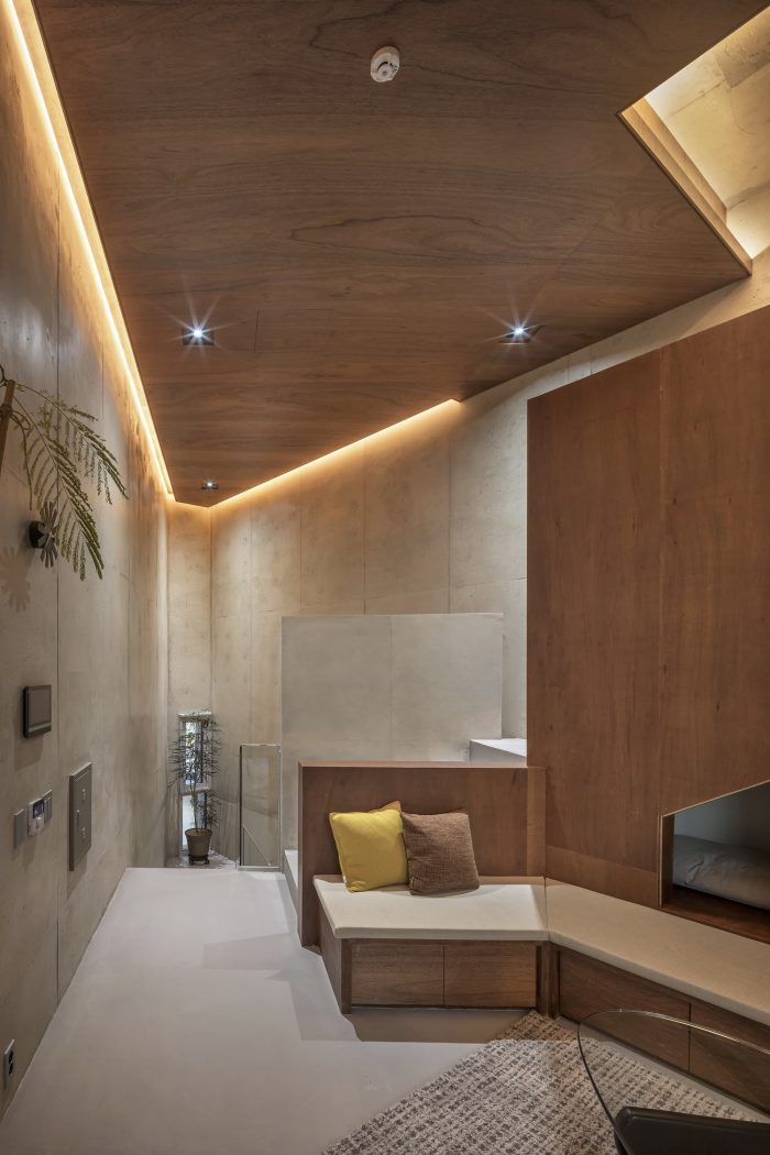 Flexible Intervention - As the space was limited, dividing, and merging the spaces centered on the stairs was a significant precondition in the design planning. To divide and merge the spaces, the house was divided into the first floor and second floor, second floor and third floor, and third floor and above, the stairs changed their function, shape, and direction for each space. The first floor has a transparent glass railing to focus on the interior materials. The second floor and third floor have framed structure that also functions as boundary walls of the bathroom, custom-made sofas, and bottom storage spaces. The third floor and above have a rhythmic string design in order to express open walls in a new way. These designs show how the stairs were designed differently based on the characteristics of each space.