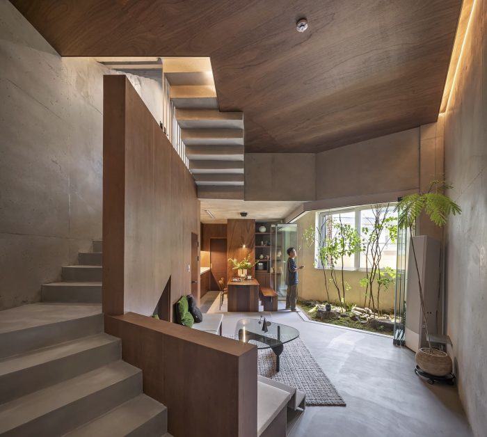 So, the house is largely divided into three functional levels. The first floor is a dining and kitchen space for spending time with friends and food. The second to fourth floors are designed for complete residence functions. Lastly, the rooftop space is designed to be a place for actively interacting with the surrounding natural environment.