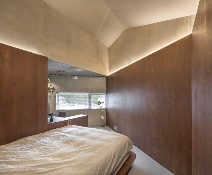 在这个房子里,除了卧室和卫生间外,其他空间的设计都尽可能地松散。对于儿童房与楼梯、走廊与洗漱洗衣空间、兴趣室与楼梯、客厅与花园之间的边界,要么采用透明玻璃开口,要么根本没有任何边界。这是为了寻求一种松散的边界,有效地利用狭窄的空间,使空间可以根据使用目的和形式进行分割或不分割。每个房间的家具都是首先设计好的,以创造一种空间上的统一感。