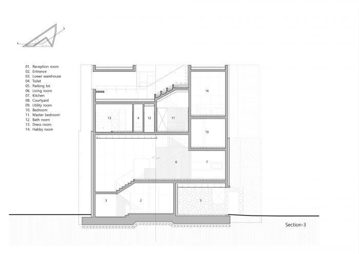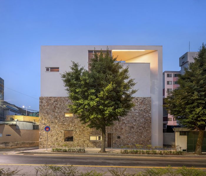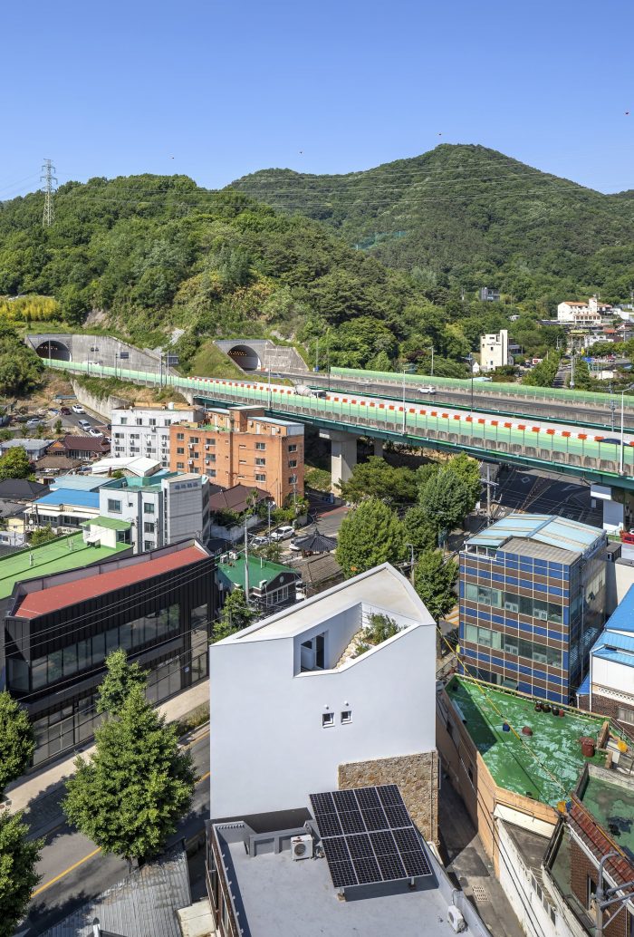 House as A Part of Scenery - The exterior wall determines the first impression of the house. It is designed by carefully piling up irregularly-shaped coursed masonry made by processing raw materials as least as possible. The two-meter pedestrian space is an open area that touches the stone wall, and it has a concrete polishing finish to make the pedestrians recognize the boundary between the road and the house even without the wall and make the drivers recognize the house as the sign placed between the boundary of the city and nature. The exterior wall openings have different sizes and locations, and they are intentionally designed disorderly in order to offset the sense of weight from hard and coarse stone walls. The rooftop canopy structure and windows get wider towards the top in order to reflect the visual relationship with the Mudeungsan Mountain in distance.