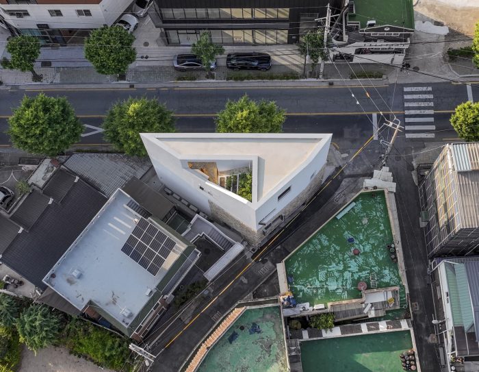 The site is located on the boundary of Mudeungsan National Park and Gwangju downtown. You can approach the site via a two-lane road that connects nature and the city together and its streetscape is a mixture of tall ginkgo trees, old houses, and commercial buildings. Since some portion of the land has been incorporated into the road during road maintenance long ago, the site has a triangular shape. In addition, the usable area has been largely reduced to 62.73m2 due to the exception of land area in accordance with widening standards for the backside road and retreat of the frontal road by two meters according to the landscape districts. Two sides of the triangular site face the road, while the third face in the south and are covered by a neighboring building.