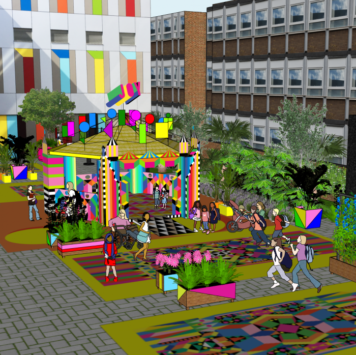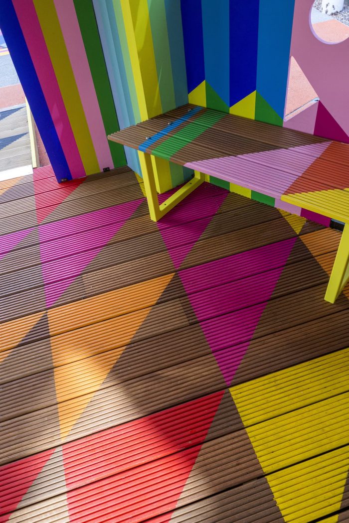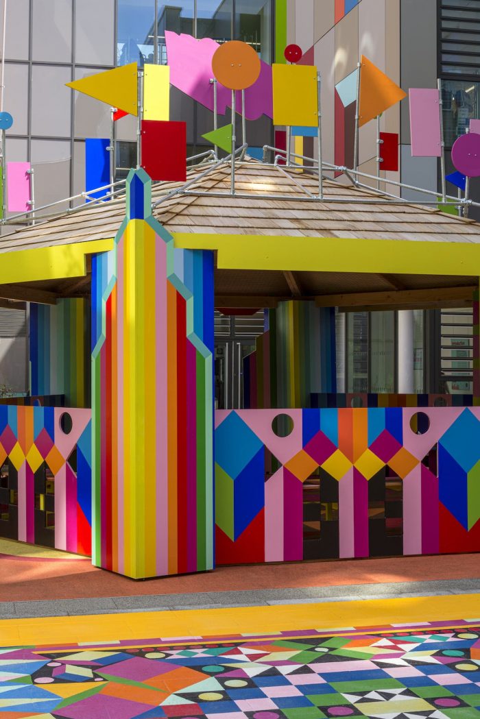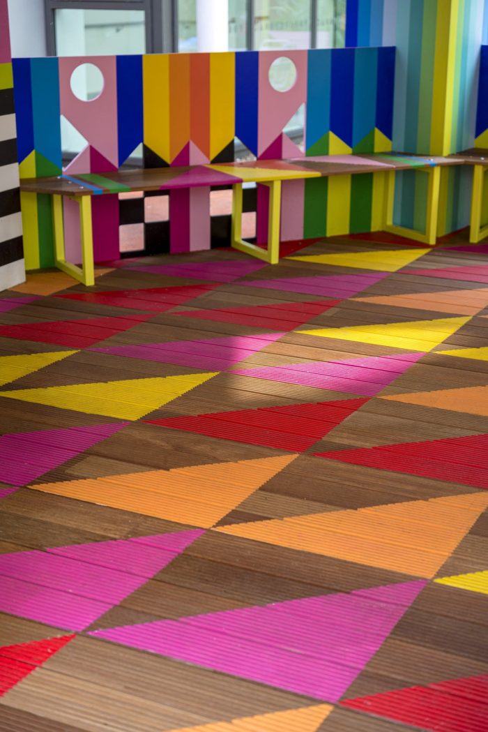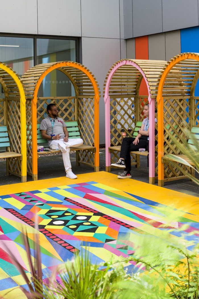‘Fragrance and colour workshop sessions’ were held by Morag at the hospital with families, staff, and a fragrance expert from method. A further aspect of collaboration can be seen in the garden’s geometrical colour-infused floor patterns, originally designed for another public artwork initiative in London, which when cancelled enabled the artist to repurpose them for use within the hospital garden. It was important to Morag to work with local craftspeople to finalise the build, she worked with Sheffield fabricator Design Workshop Ltd for the main structure of the Joy Garden, while the panels were painted by Morag in her studio using YesColours who gifted the paint to the project.