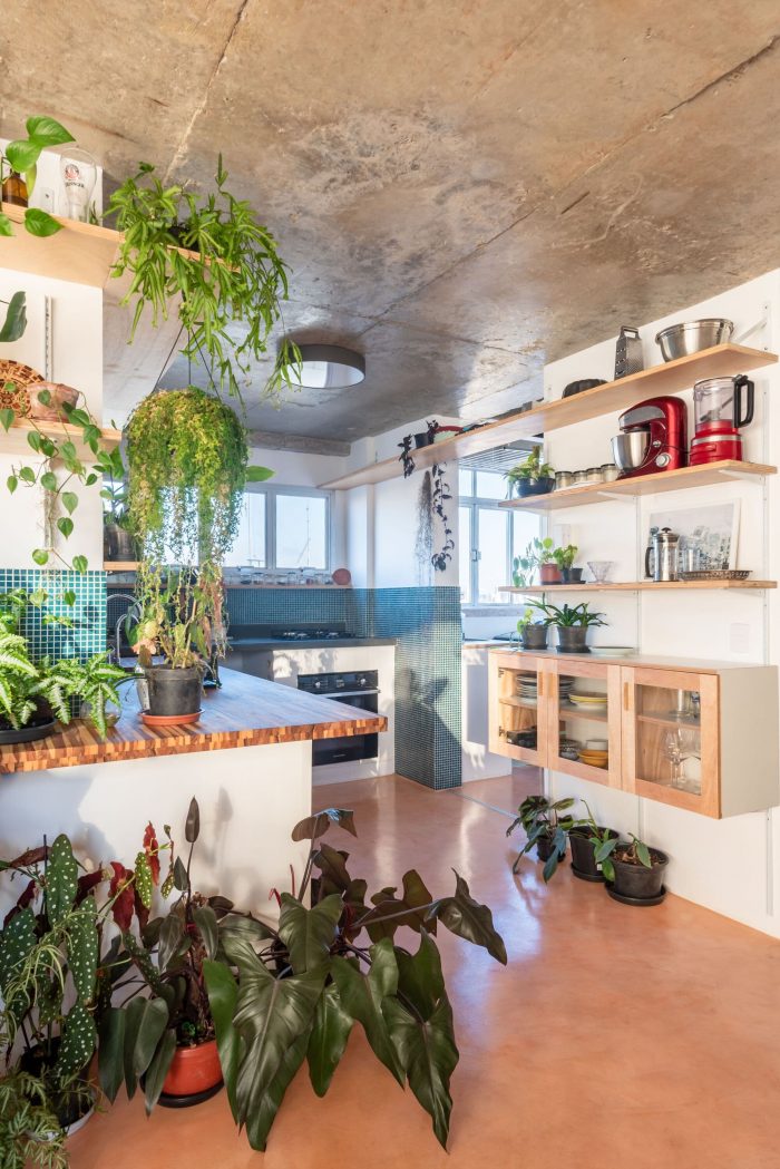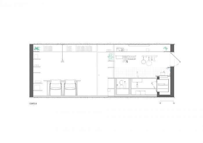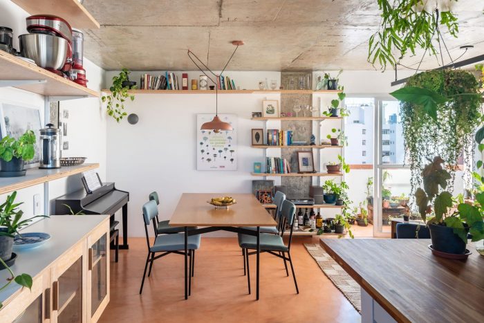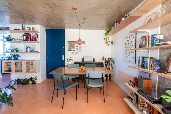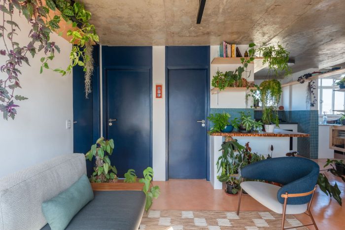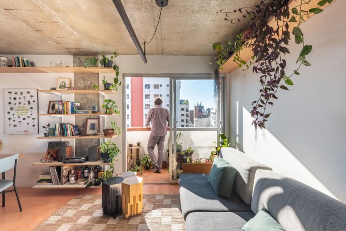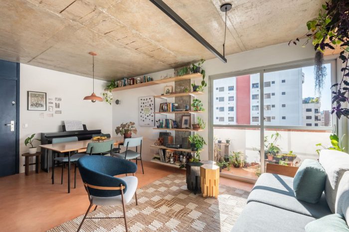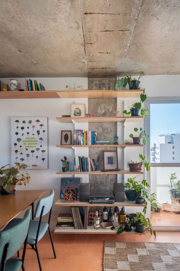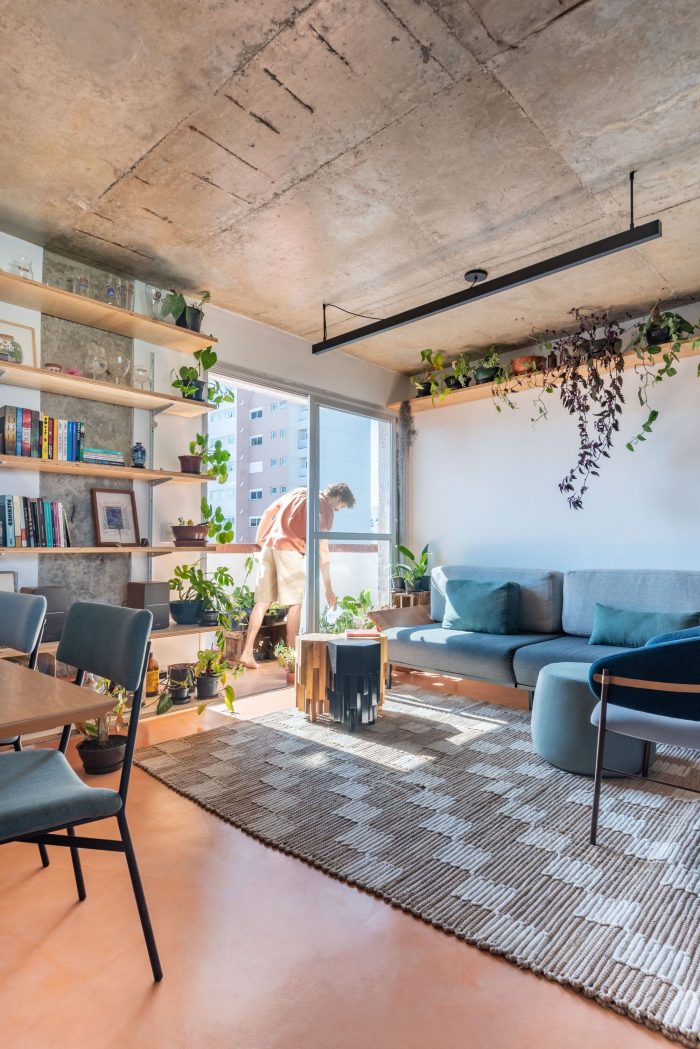 A single floor throughout the apartment reinforces the integration and dilutes hierarchies of use between the environments. In order to have an economical and low waste generation project, plumbing and electrical points were kept, doors and cabinets were refurbished and received new paint and hardware. As a major operation, only the removal of the dividing wall between living room and kitchen, which creates a single environment that is illuminated and ventilated by all the openings in the apartment.