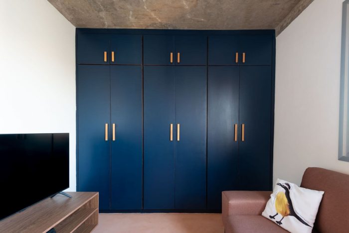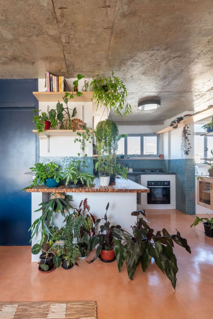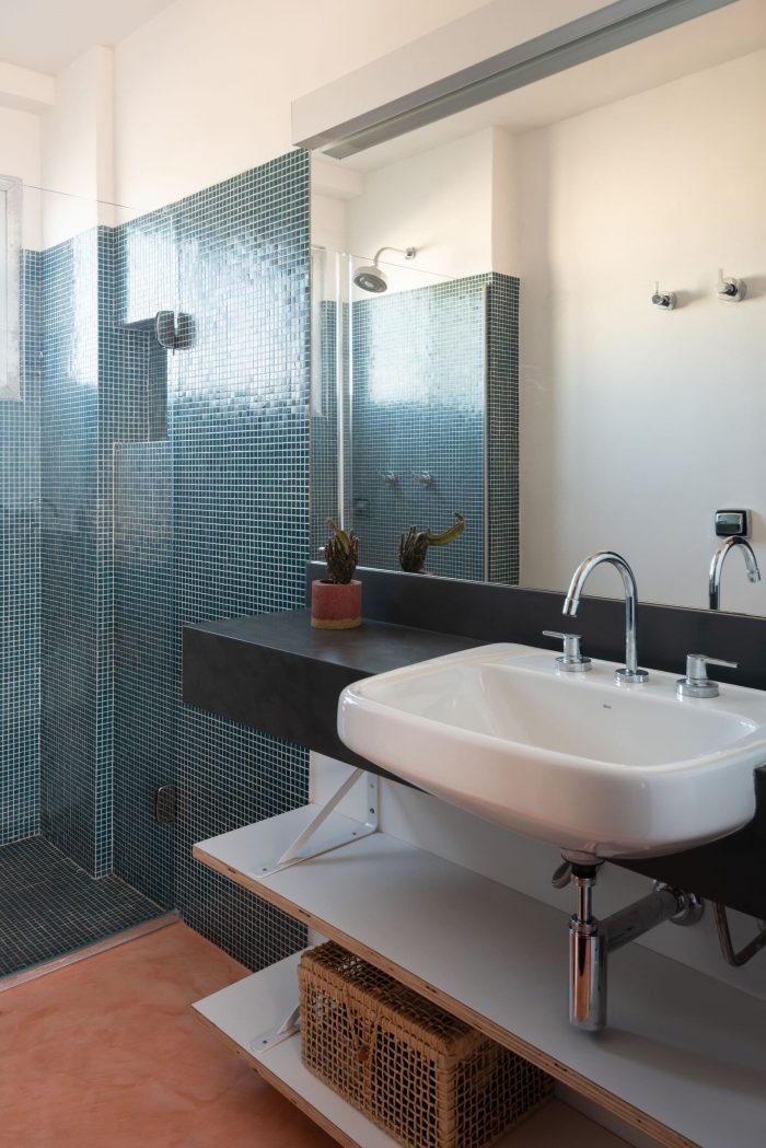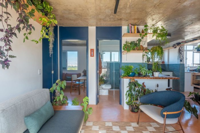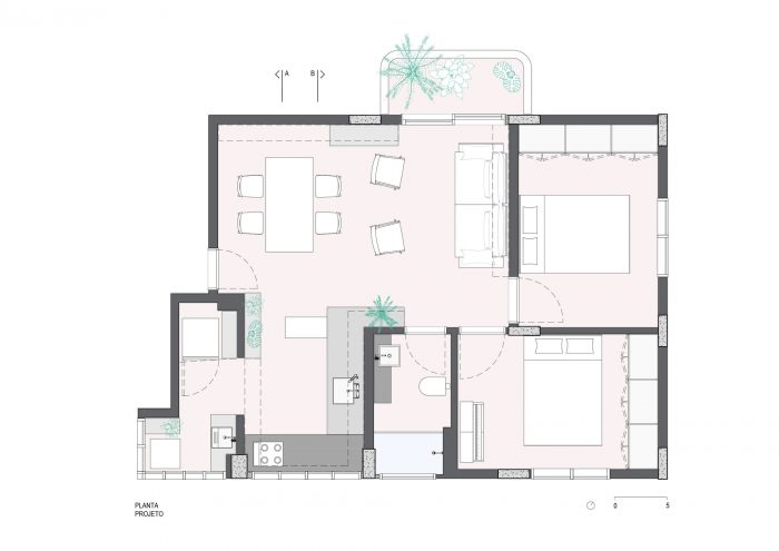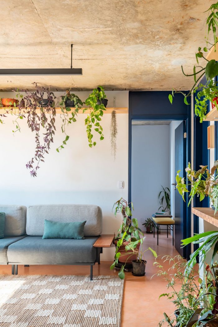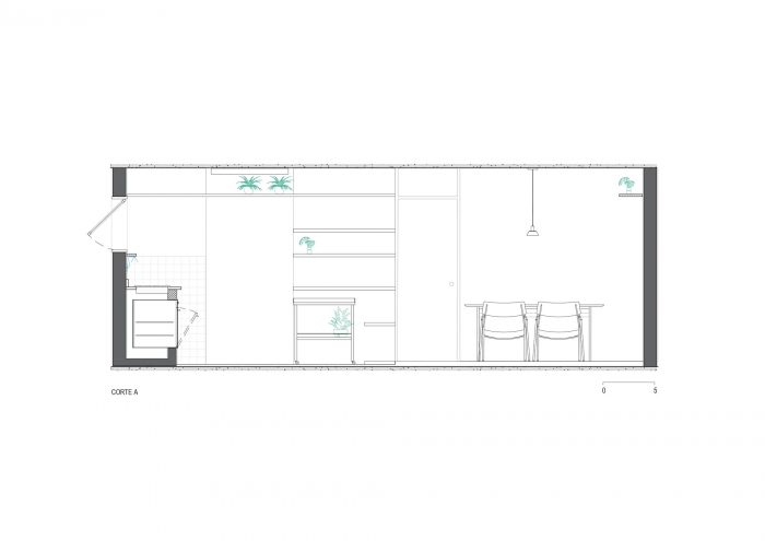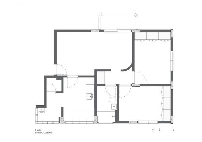 A single floor throughout the apartment reinforces the integration and dilutes hierarchies of use between the environments. In order to have an economical and low waste generation project, plumbing and electrical points were kept, doors and cabinets were refurbished and received new paint and hardware. As a major operation, only the removal of the dividing wall between living room and kitchen, which creates a single environment that is illuminated and ventilated by all the openings in the apartment.