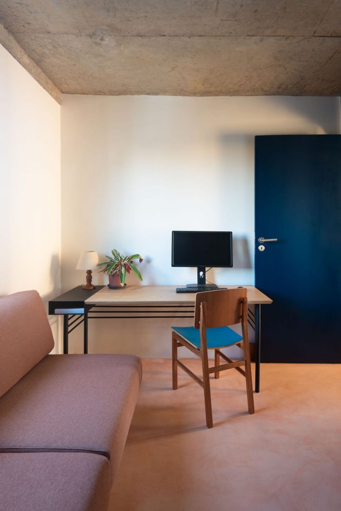 With the goal of freeing up as much area as possible for free and unimpeded occupancy, the basic principle of the project is to use the confines of the apartment as a support for all basic living activities. Thus the walls of the apartment are occupied with shelving systems and countertops, supporting activities such as cooking, working and storage.