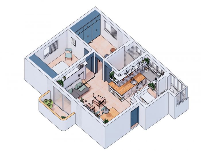 整个公寓只有一个楼层,加强了整合,淡化了房间之间的使用等级。为了寻找一个经济的工作,并减少废物的产生,液压和电力点被保留下来,门和柜子被改造成新的绘画和铁制配件。作为一个主要的操作,只有拆除客厅和厨房之间的隔断墙,这创造了一个单一的环境,由公寓的所有开口来照明和通风。