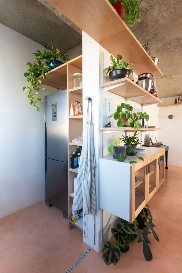 为了腾出尽可能大的面积让人自由无阻地居住,项目的基本原则包括利用公寓的边界作为所有基本生活活动的支持。这样一来,公寓的墙壁被架子系统和长凳占据,支持烹饪、工作和储存等活动。