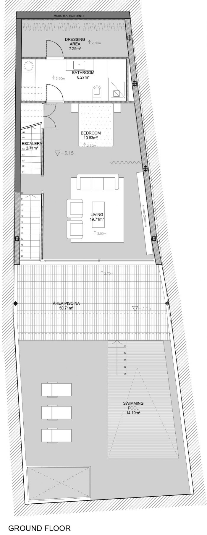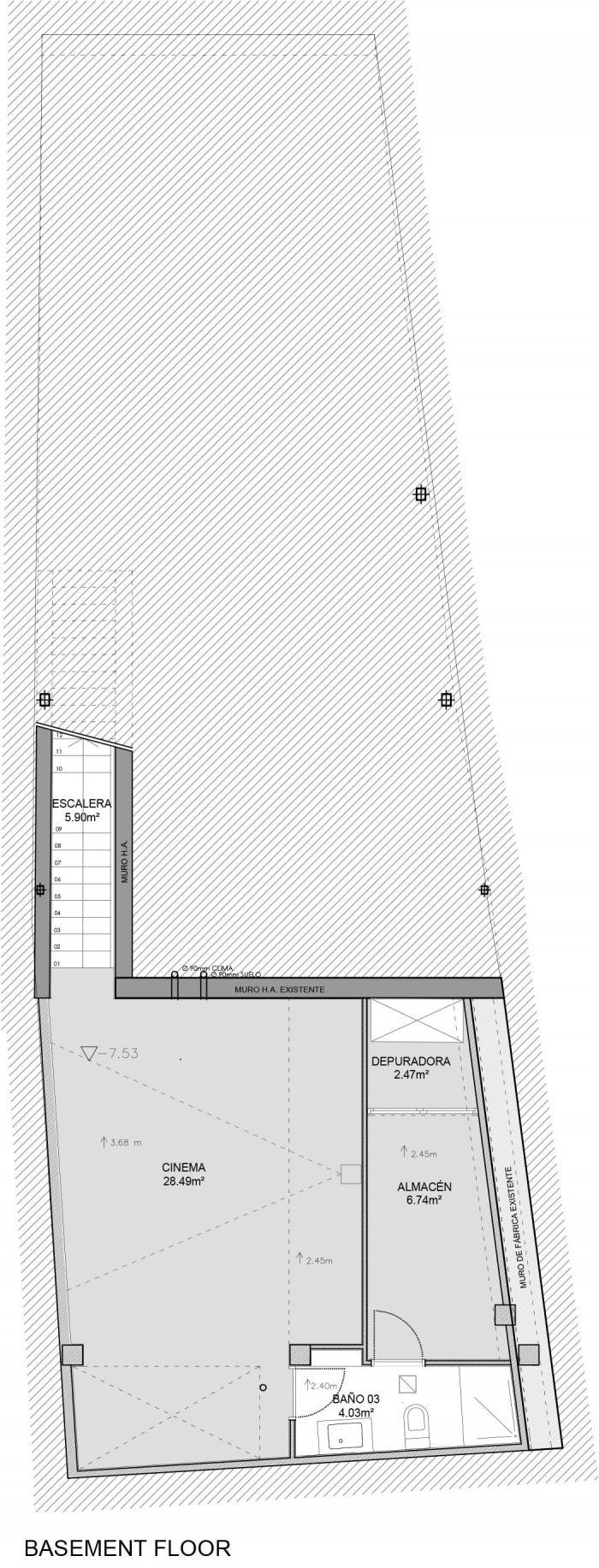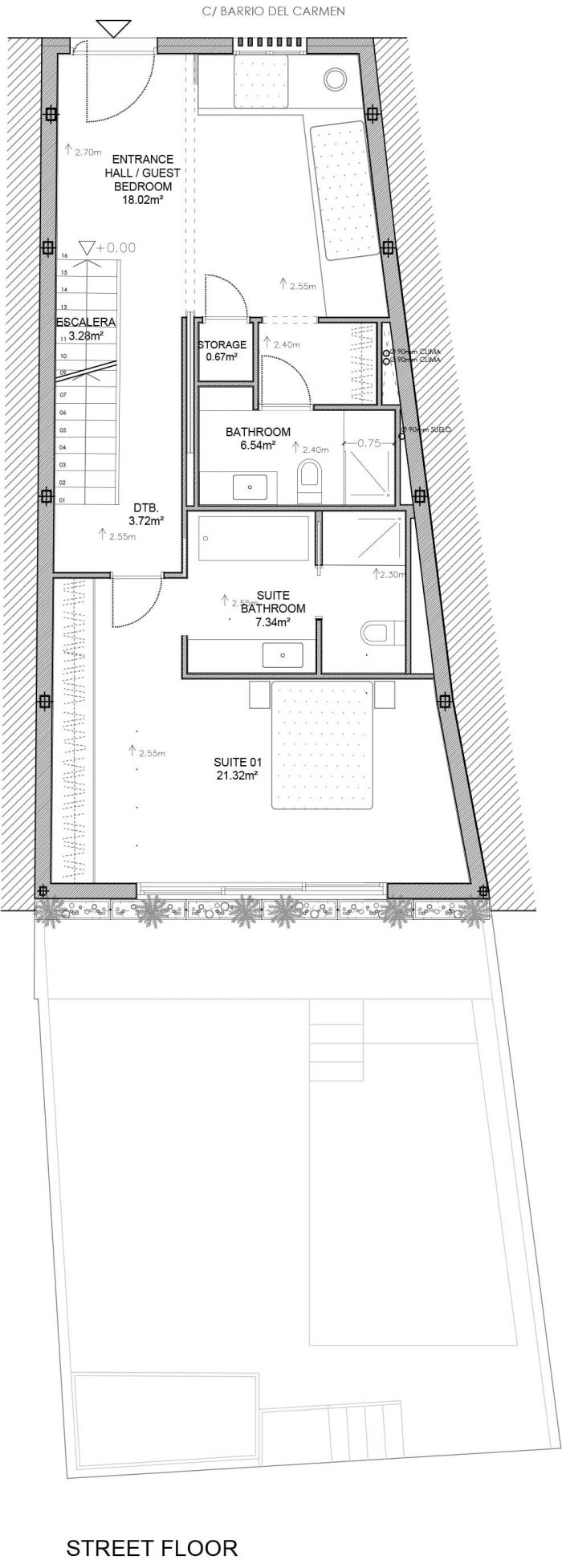 We have an empty plot at the time of starting the project. This site has a very pronounced unevenness. The house accommodates itself to it, trying not to modify the existing topography. For this, the house is adjusted to the existing walls used (facing the street and another intermediate) and the heights.