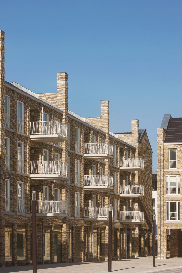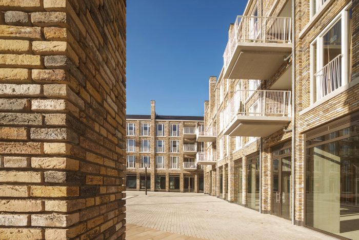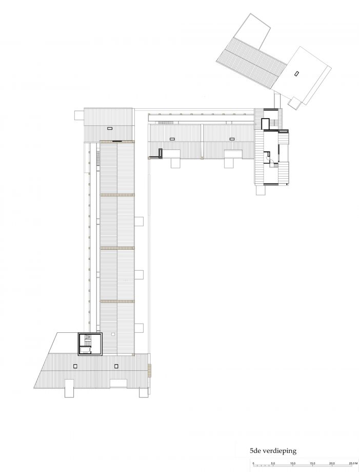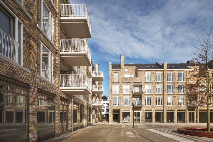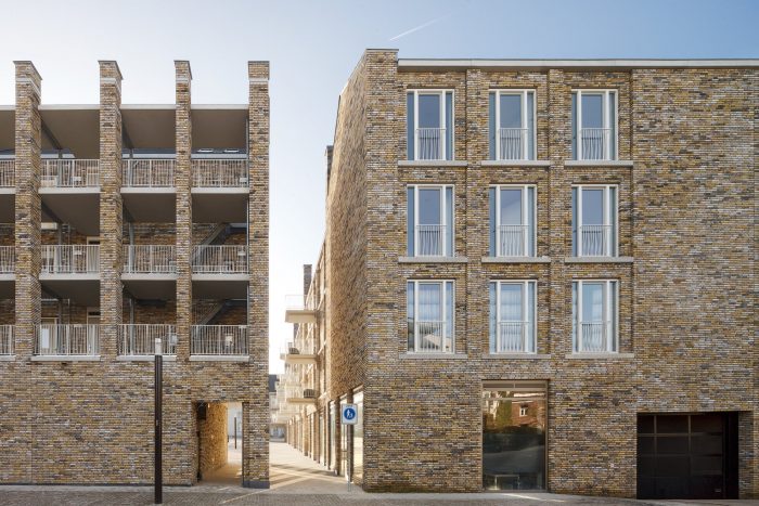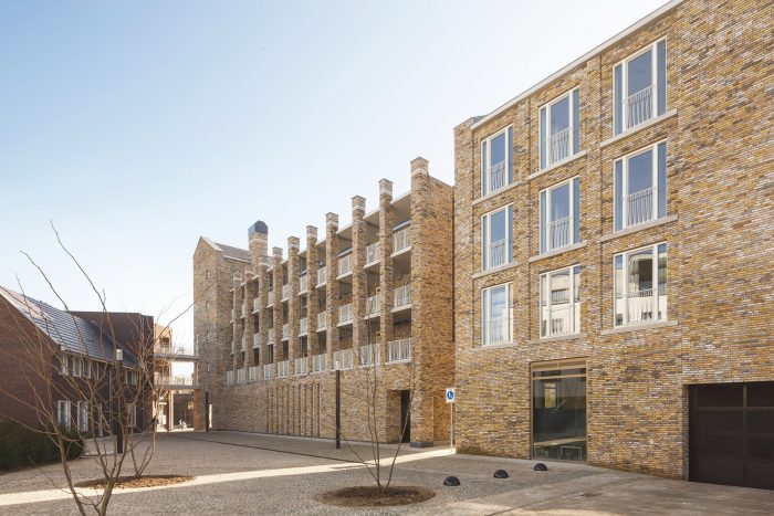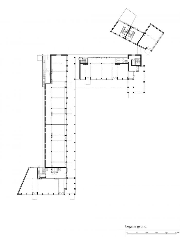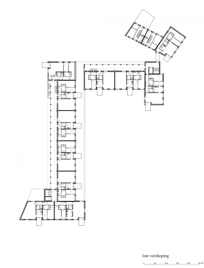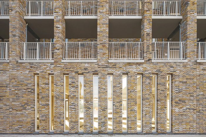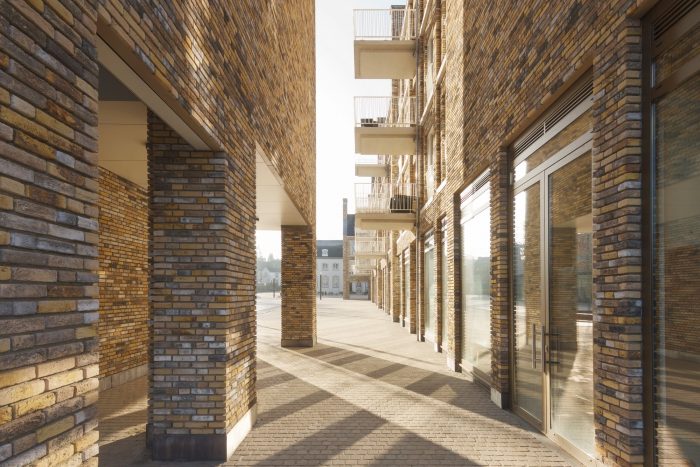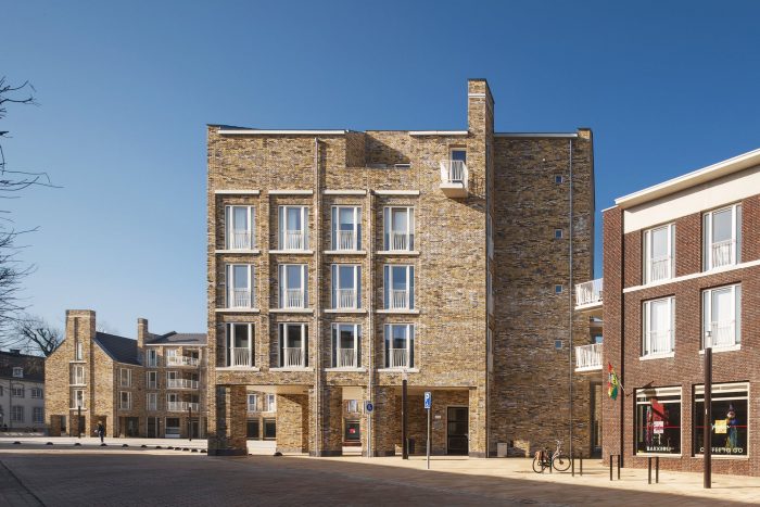 Our L-shaped residential and commercial block surrounds the square with a natural yellow-brown, highly nuanced, handmade brick fired from nearby Maas clay, leaving striking white to the adjacent town hall. The architectural 'language' speaks in the same staccato rhythm as the large monuments and monumental houses a little further on, but also tells its own story, through the consistent repetition of a limited number of recurring architectural elements.