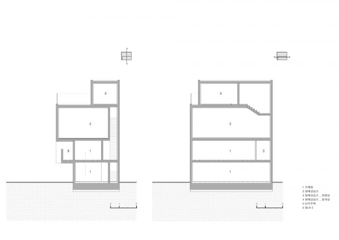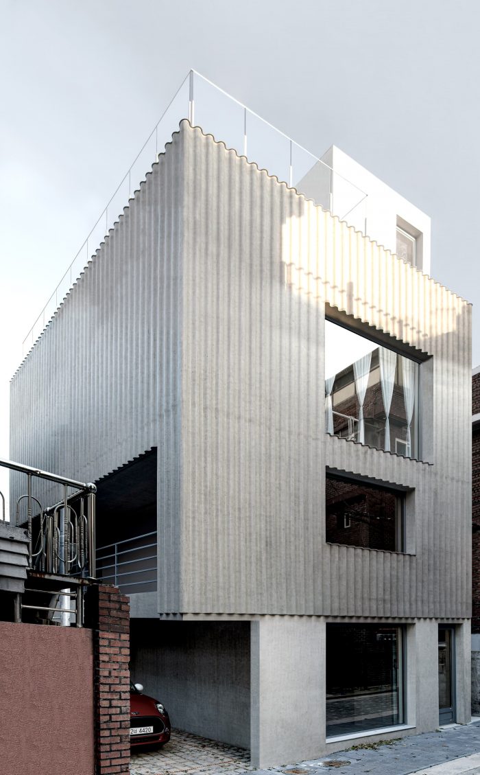 The exposed concrete was designed as the embodiment of a wave-shaped acoustic sound to represent a trajectory of a beautiful life. To implement wave intervals with 200mm in pitch, various mockup tests and construction methods were attempted from the stage of forming a mold. The use of the materials for construction and decoration was minimized in both inside and outside the architectural space to implement the texture of exposed concrete to realize the essence of art. This is an architectural outcome containing the intention of the building owner to remember the essence of art and original idea, starting with the objective of pursuing the purity of materials. The changes and flows of light drawn by the exposed concrete waveshapes look as if they are dancing in a group according to changes of the sun and try to project a trajectory of the building owner’s life, encompassing painting, dancing and music further they give a calm pictorial sensibility to the architecture and the city a calm picture.