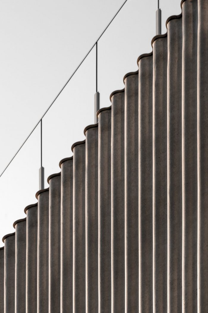 裸露的混凝土被设计成波浪形声响的体现,以代表一个美丽的生活轨迹。为了实现间距为200毫米的波浪间隔,从形成模具的阶段开始就尝试了各种模拟试验和施工方法。在建筑空间的内部和外部,尽量减少建筑和装饰材料的使用,以实现裸露混凝土的质感,从而实现艺术的本质。这是一个包含了建筑主人对艺术本质和原始想法的意图的建筑成果,其出发点是为了追求材料的纯粹性。暴露在外的混凝土波浪形的光的变化和流动,看起来好像是在根据太阳的变化而群舞,并试图投射出建筑主人的生活轨迹,包括绘画、舞蹈和音乐,进一步给建筑带来平静的图像感,给城市带来平静的图画感。