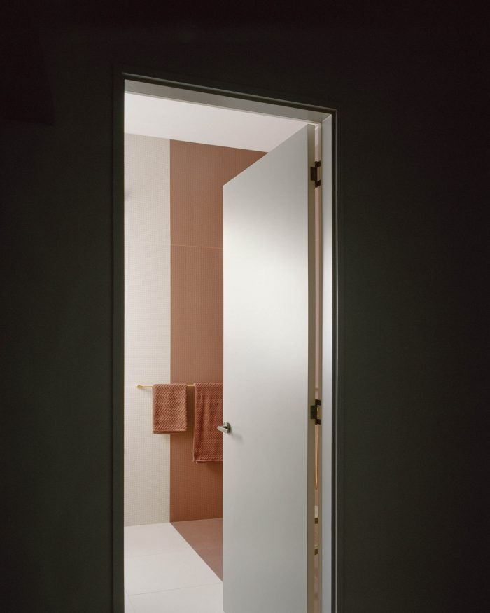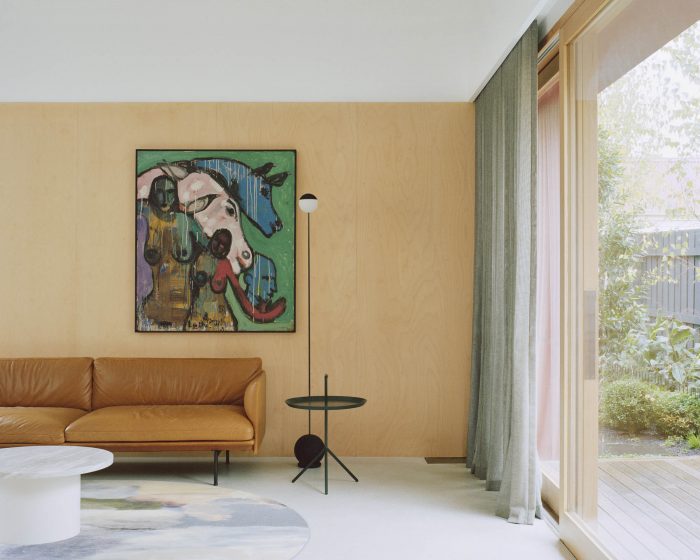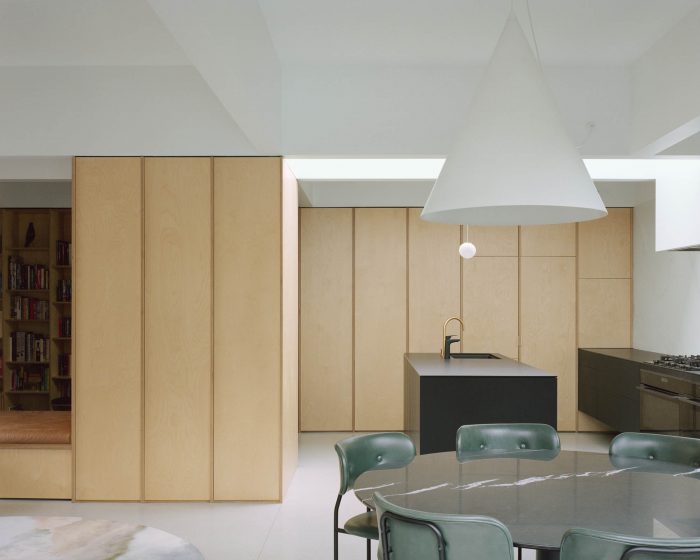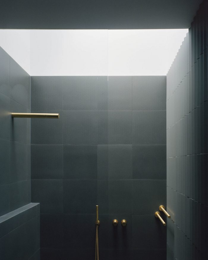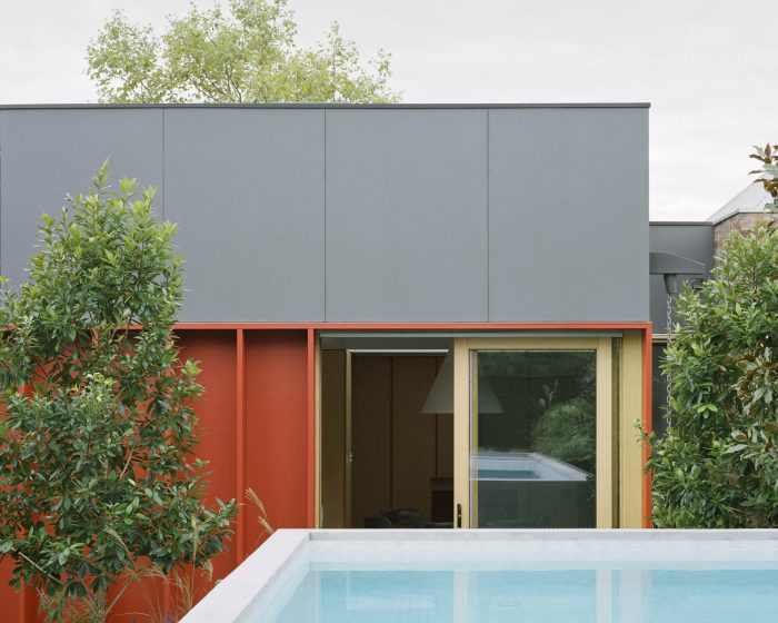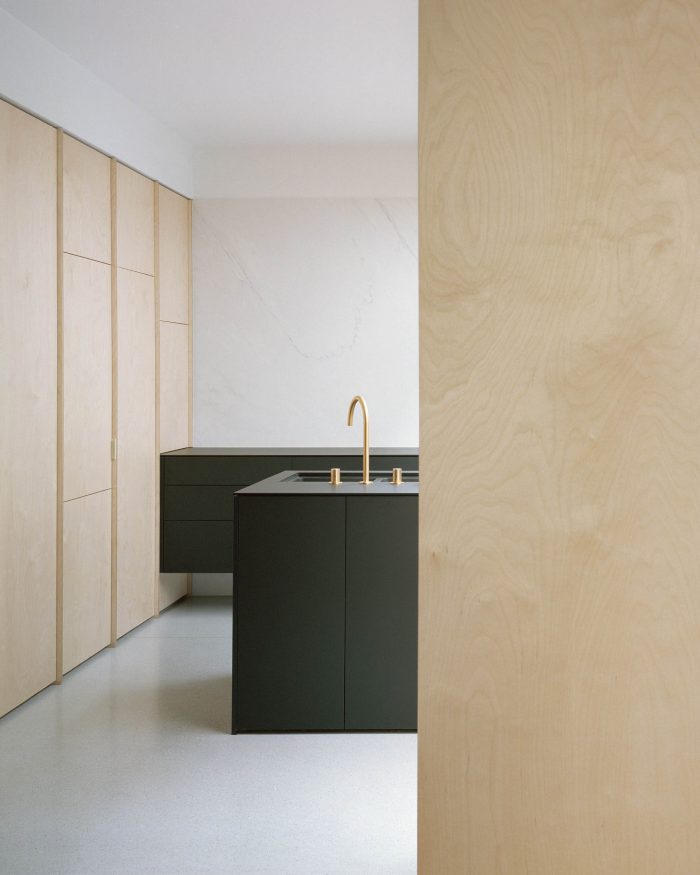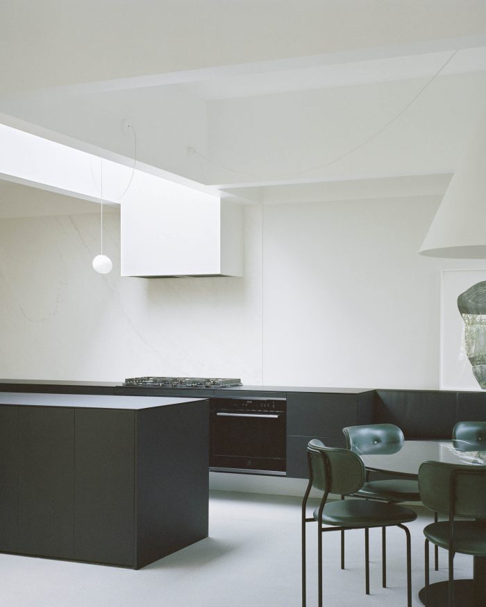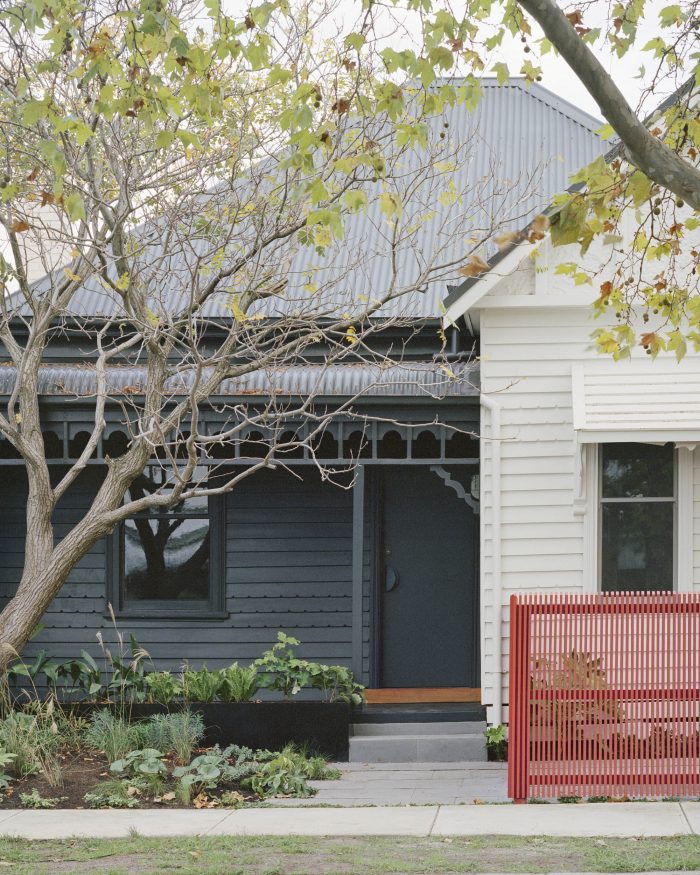 The materials and finishes are applied in blocks of texture and color to define different elements or sections of the house. The existing house is divided into two – a light volume for kids bedrooms and study, and a darker ‘moody’ volume housing the main bedroom/ensuite and the corridor connecting to the new extension. The new spaces are much brighter and more stripped back, with a combination of the terrazzo floor, plywood joinery and walls and two minimal black kitchen cabinets. Externally, the new addition is distinguished from the old house with a combination of dark cladding and a series of the deep red door reveals and fins which give the façade depth, texture and protect openings.