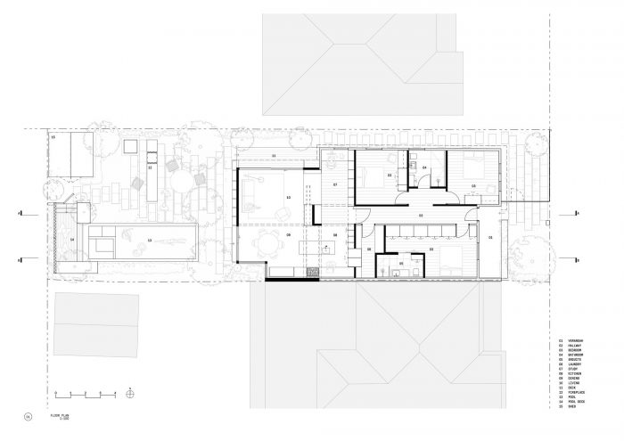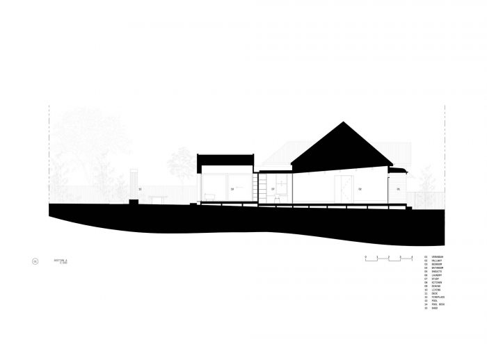 新的空间围绕着一个储藏室,里面有一个隐蔽的、可伸缩的电视和其他技术设备,还有一张日间床,在书房(现有房屋的最后一个房间)和新的生活区之间创造了一个连接空间。景观和游泳池通过重叠不同的种植、游泳和聚会区域,在室外继续这种方法。与室内的日光浴床和储藏室相呼应,花园被地上的游泳池、一个长的混凝土长椅和一个定制的钢制户外壁炉的垂直体积所点缀。