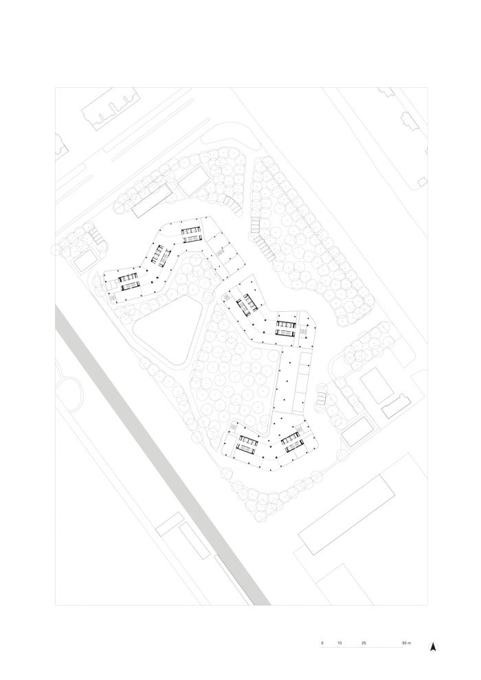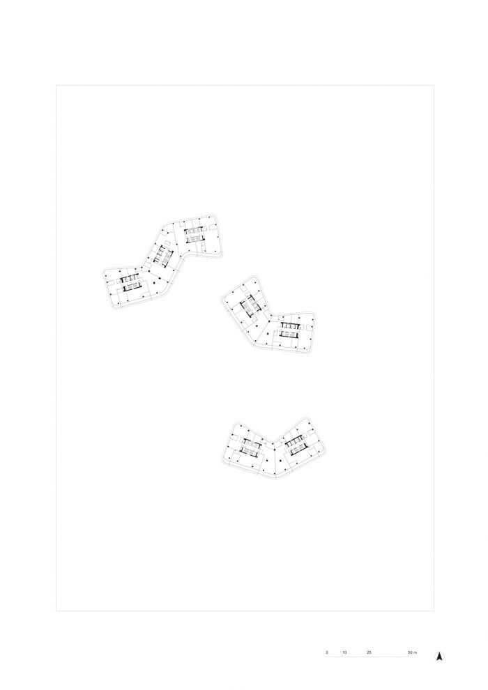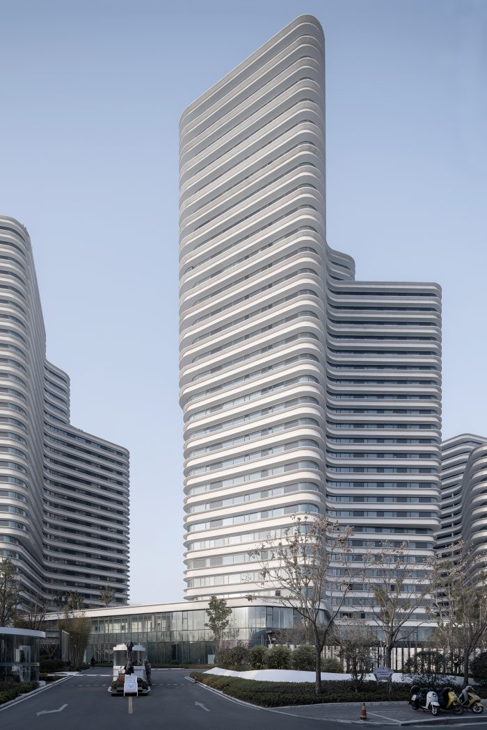摒弃了中国特有的单调、平行排布的公寓楼,而采用了具有个性的强大建筑。地面上的建筑面积约为120,000平方米,分布在三座不同形状的塔楼上,这些塔楼在地面上由一个基座层连接。塔楼的布置确保了每个公寓中至少有部分房间是朝南的。根据详细的日照分析,塔楼的脚印是倾斜的,其高度也是错开的,以防止过长的阴影投射到任何一个建筑上。