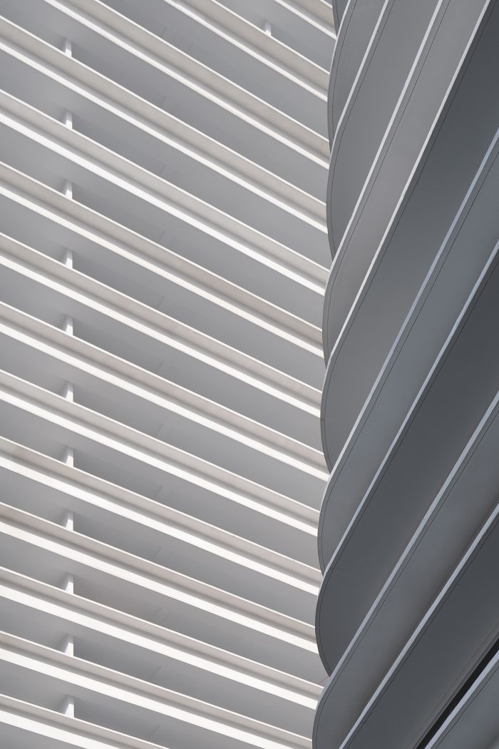 该项目由其外墙的雕塑力量所定义。轮廓鲜明的混凝土条在建筑周围以柔和的曲线运行,强调了它们类似物体的自主性。外层采用原地浇筑混凝土立面的形式,玻璃幕墙向后退了两米,形成了深邃的露台。内层立面的封闭部分用黑色玻璃覆盖,使其像窗户一样退到轻质混凝土条后。