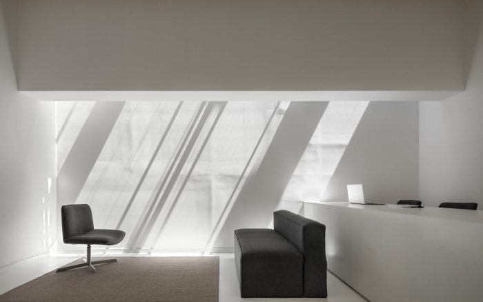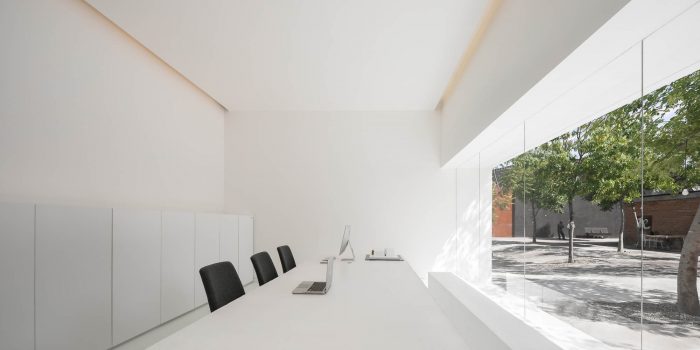 Next comes the theoretical work area. This is a very particular space since it closes completely to the outside. It is illuminated and ventilated in a zenithal way giving it a sacred quality... almost like a church. It has a very introspective nature, which captivated us because meditation is a very important tool that we use in our creative process.