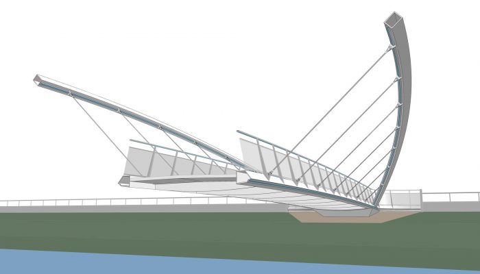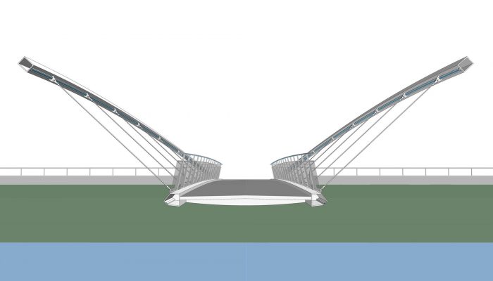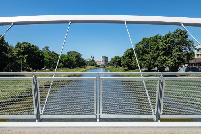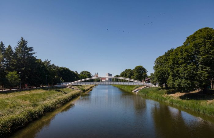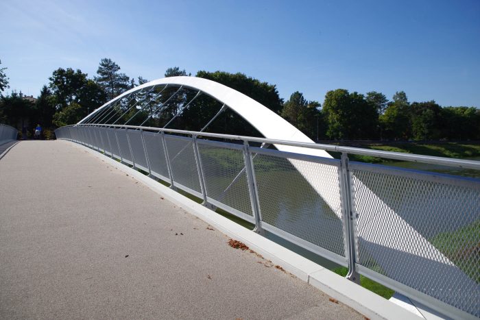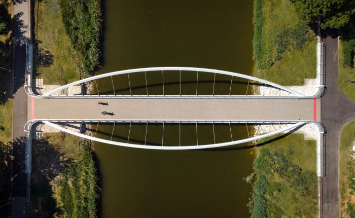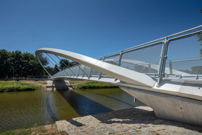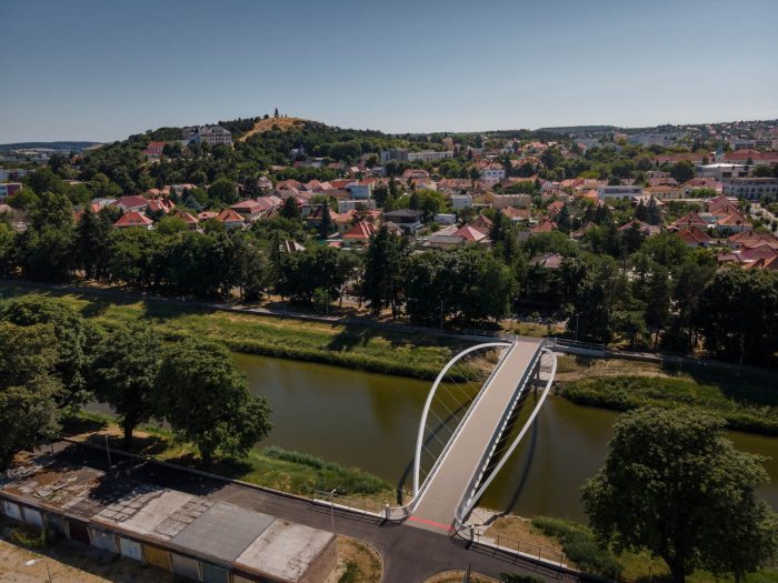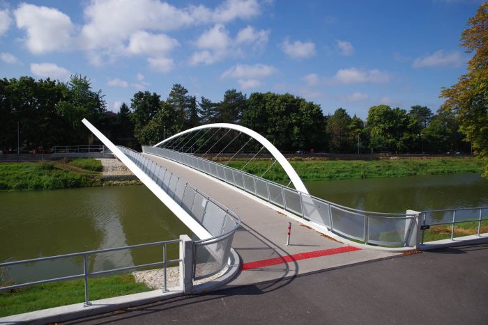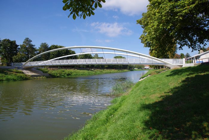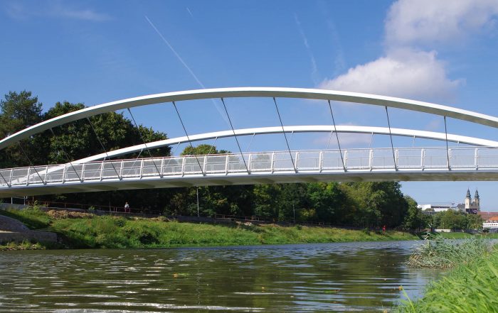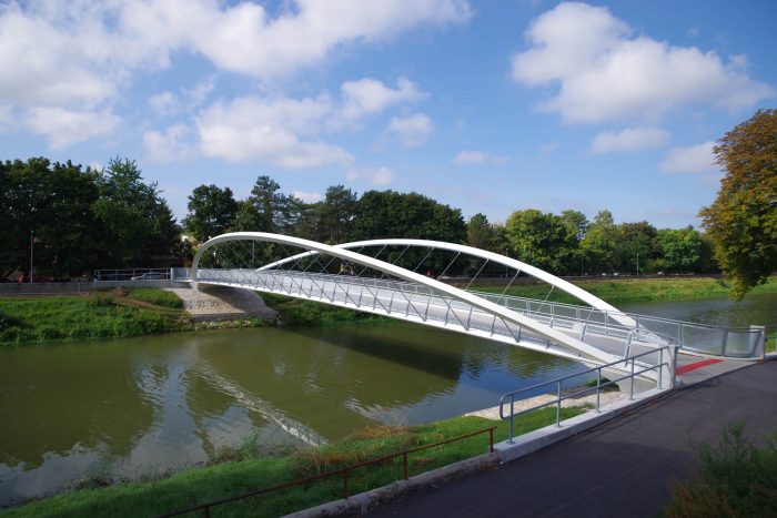 The bridge connects pedestrian and cyclist trails situated along both banks of the River Nitra in a city of the same name. Due to local constraints the bridge structure with a very slender deck was required. Also, any load bearing members, such as pylons and cables, situated beyond the sidewalks were not allowed. Therefore, an economical tied arch structure, which represents a most logical solution, has been chosen. To allow an un-disturbing view of a historic centre of the city, the rise of the arches is as small as possible. To open the space and to invite using the bridge, the deck is suspended on outwards inclined arch ribs. In this way the river bridging received a modern, dynamic appearance.