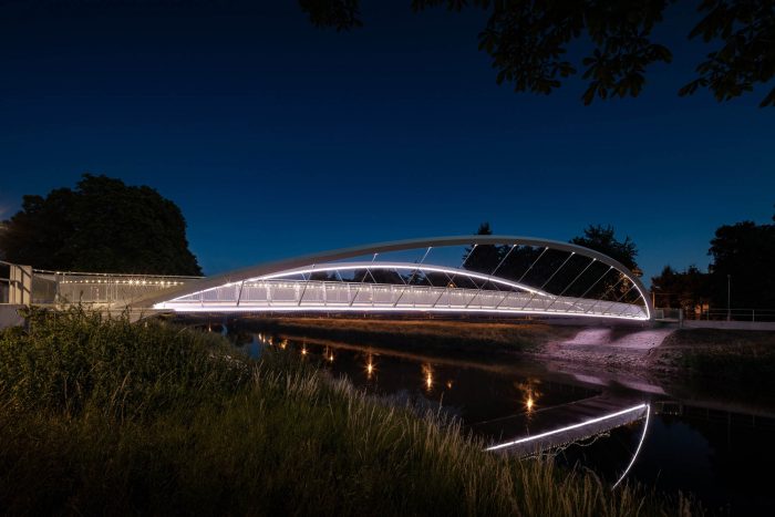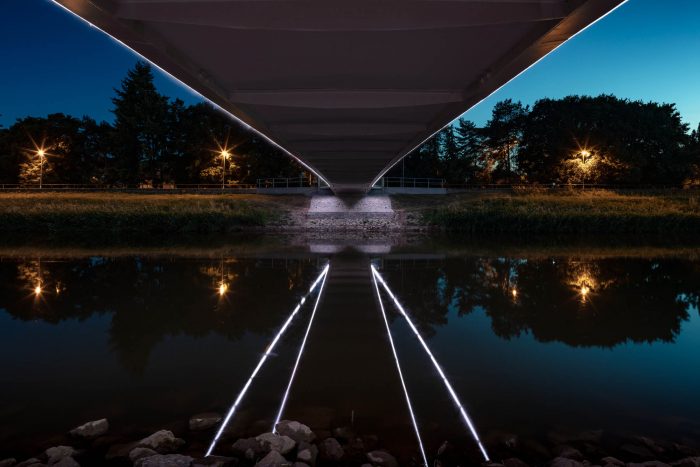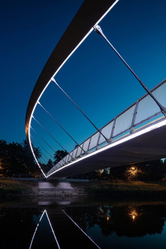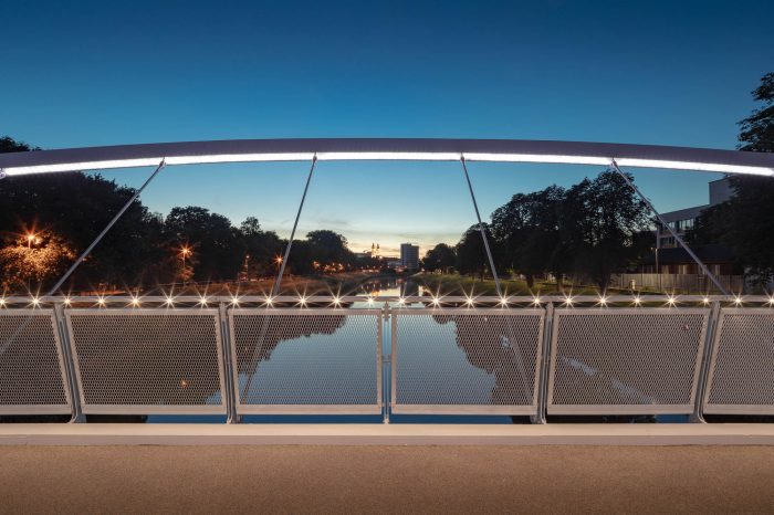 The steel structure is painted white, the walking surface is illuminated by LED lights situated in the hand rails. Both, the arches and edge girders are illuminated by LED lights situated at their bottom flanges.