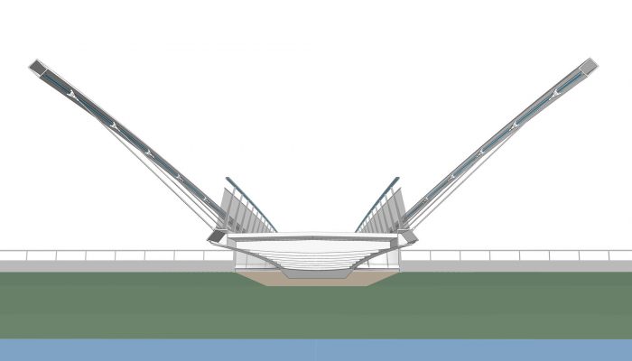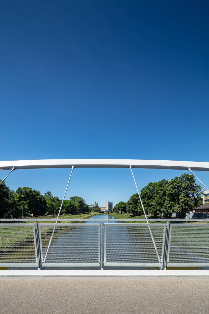 该桥连接了位于同名城市尼特拉河两岸的行人和自行车道。由于当地的限制,需要采用非常细长的桥面结构。此外,任何承重构件,如铁塔和电缆,位于人行道之外都是不允许的。因此,我们选择了一种经济的系杆拱桥结构,它代表了一种最合理的解决方案。为了使城市历史中心的景色不受干扰,拱门的高度尽可能的小。为了开放空间并邀请人们使用这座桥,桥面被悬挂在向外倾斜的拱肋上。这样一来,河桥就有了一个现代的、动态的外观。