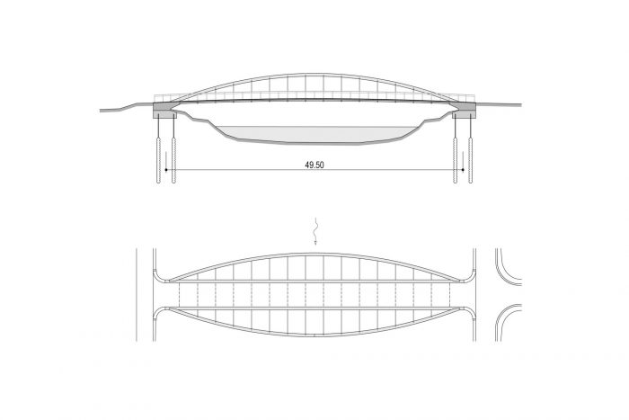 The bridge deck is in a crest curve with a maximum longitudinal slope of 5.0%. The span length is 49.50 m, the free width between the railings is 4.00 m. Since the bridge deck is fixed connected with the end abutments supported by micro-piles, the structure forms an integral structural system. The deck, which is composed of two steel edge girders stiffened by floor beams and precast concrete slab members, is on its edges suspended on steel arch ribs of trapezoidal box sections. To avoid cracks in the concrete deck, the structure is longitudinally post-tensioned by prestressing cables situated in the boxes of the edge girders.