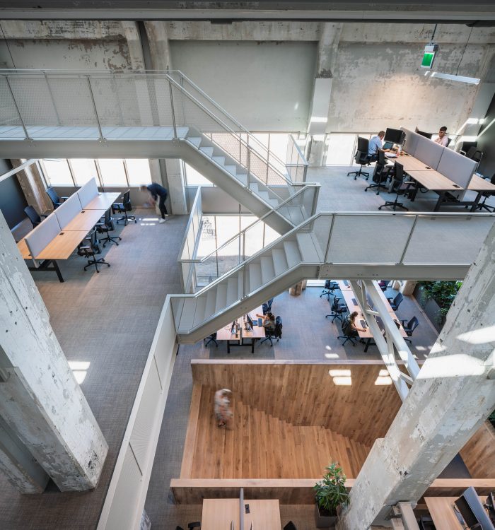 Three-dimensional composition. The new floors hang in the open space as an elaborate three-dimensional composition. These new platforms create diverse working spaces with specific qualities. Each place is connected to other spaces and simultaneously offers groundedness. By keeping the central access free from construction, the spaciousness of the building is maintained.