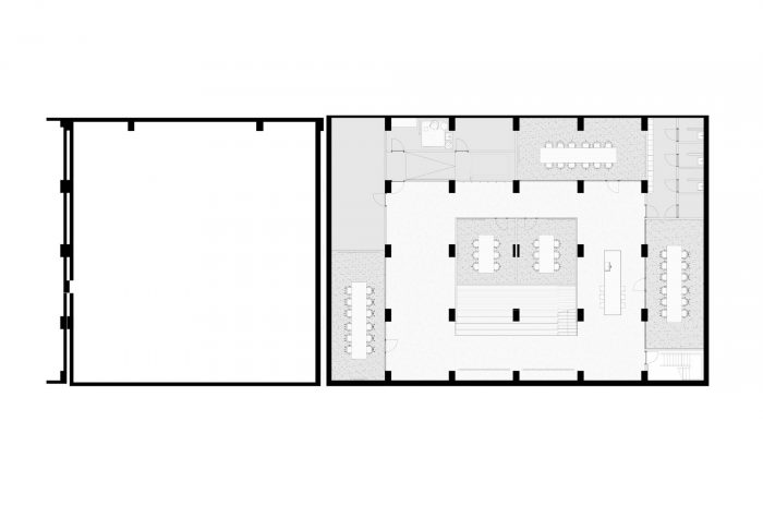 In the former production hall, huge industrial boilers were placed on a heavily raised floor. After the removal of the boilers, the almost sacred beauty of the space was revealed. This light and spacious hall is in strong contrast with the ground floor and basement, which due to their concrete structure have a much heavier character. A new timber staircase now connects these two worlds and forms the starting point of a new central route connecting all new floors.