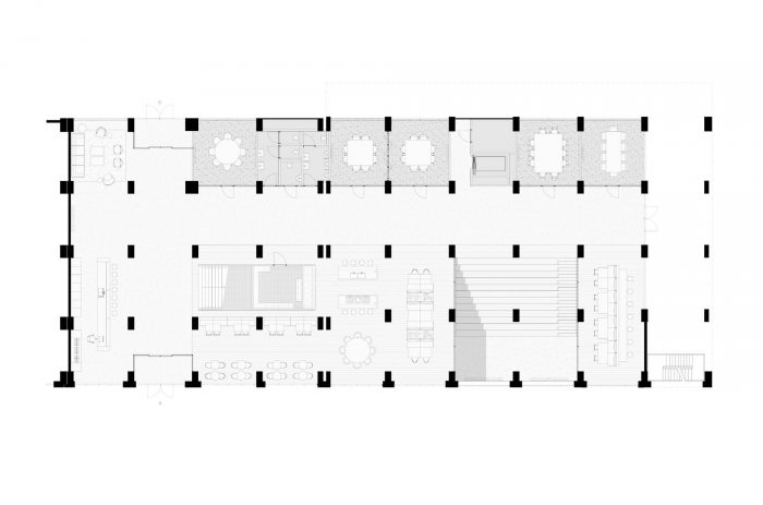Dynamic office. Next to the main entrance, a long bar element stretches out and doubles as a reception. The ground floor also features multiple meeting rooms and a restaurant. A big new void with a grandstand staircase allows daylight to enter the souterrain. The staircase doubles as a big presentation and event space. To stimulate movement, the elevator is hidden in a black volume that penetrates all floors.