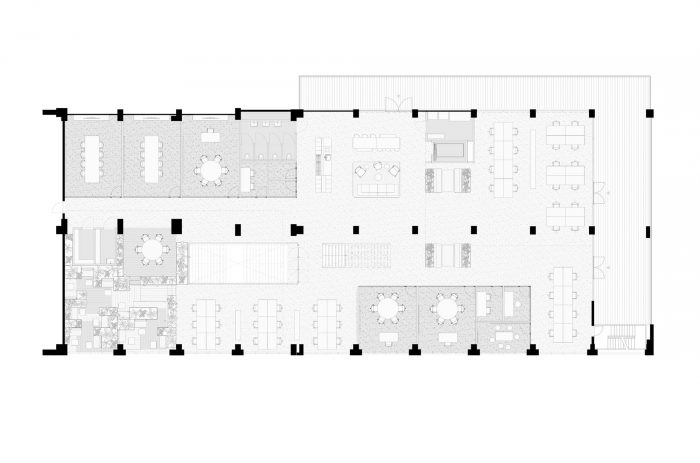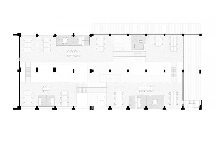 动态的办公室。在主入口旁边,一个长条形的酒吧元素延伸出来,并作为接待处。一楼还设有多个会议室和一个餐厅。一个带有看台楼梯的新大空隙让日光进入南风。楼梯可作为一个大的演示和活动空间。为了刺激运动,电梯被隐藏在一个黑色的体积中,穿透所有楼层。