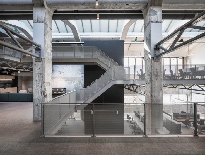 A former nylon factory is completely transformed into a unique office. A new framework of steel platforms is hung from the existing concrete structure. Vision and design complement each other in this co-creation of HofmanDujardin and Schipper Bosch, situated on the cleantech campus Industriepark Kleefse Waard in Arnhem, Netherlands. The plan builds upon existing qualities and combines extra floor space with a clear routing, transforming the KB building into a dynamic office space.