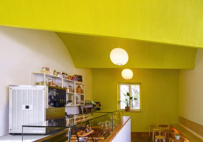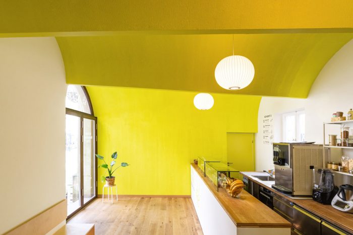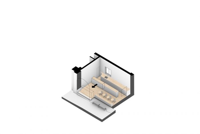 The broom finish texture emphasizes the vaults and creates directionality to become the main unifying design element.The furniture has a clean, longitudinal layout that divides the space into a customer- and serving-area. All vertical surfaces are made out of oak wood. The Counter is movable for the possibility of direct street vending.