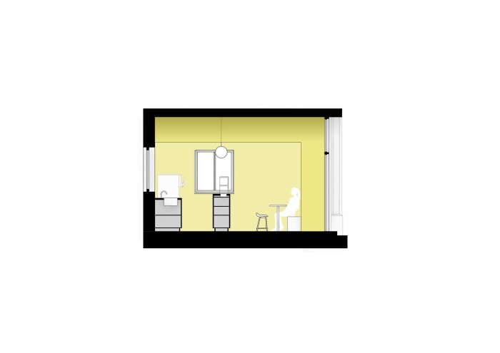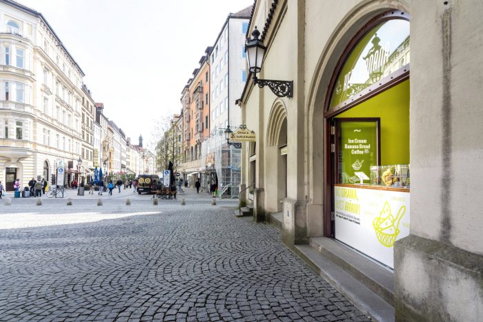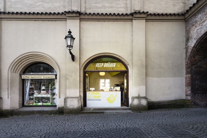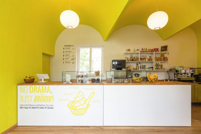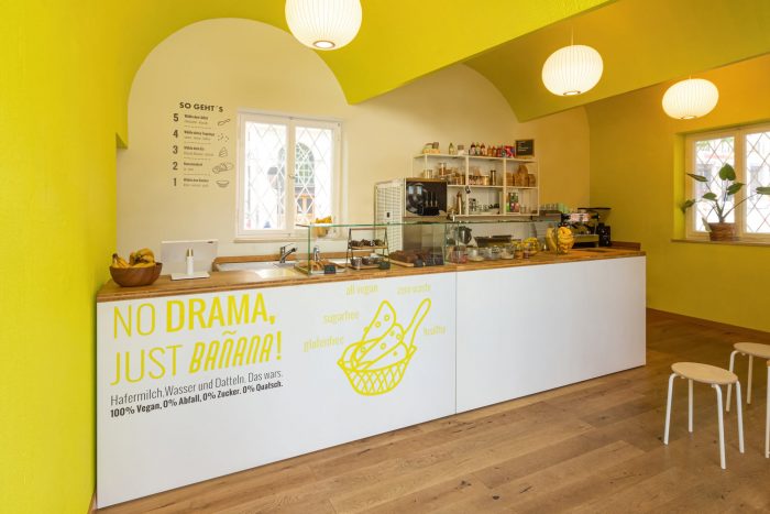 The client’s vision was a vegan ice cream shop using only bananas which are too old for sale but just perfect for ice cream. The shop is located in the side wing of Sendliner Tor and a central pedestrian area. However due to its small shopfront pedestrians needed to be attracted and the shop needed to draw attention. The exiting entrance door was replaced with a tree wing door to fully open and to melt the interior with the exterior.