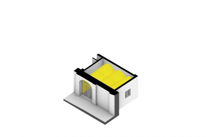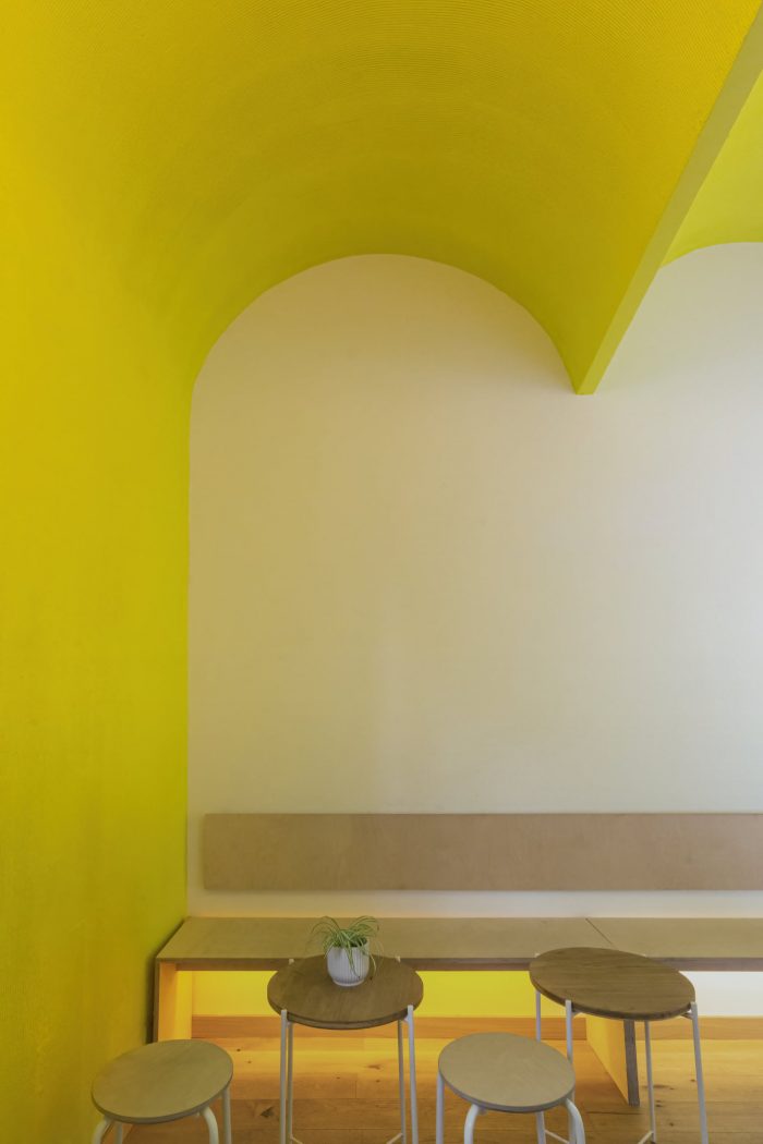 The existing arched door served as an inspiration to use the forced perspective following the principle of Palazzo Spada by Architect Francesco Borromini built in 1635. The forced perspective creates an optical illusion and plays with the customer’s perception. The cone-shaped vault extends from the exiting arched entrance. The other two arches counter and frame the room like one big brush stroke.
