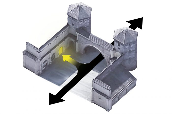 现有的拱形门成为使用强制透视法的灵感来源,该法遵循建筑师弗朗切斯科-博罗米尼(Francesco Borromini)在1635年建造的斯帕达宫的原则。强迫透视法创造了一种视觉错觉,并与客户的感知相联系。圆锥形的拱顶从出口的拱形入口处延伸出来。另外两个拱门反衬和框住了房间,就像一个大画笔。
