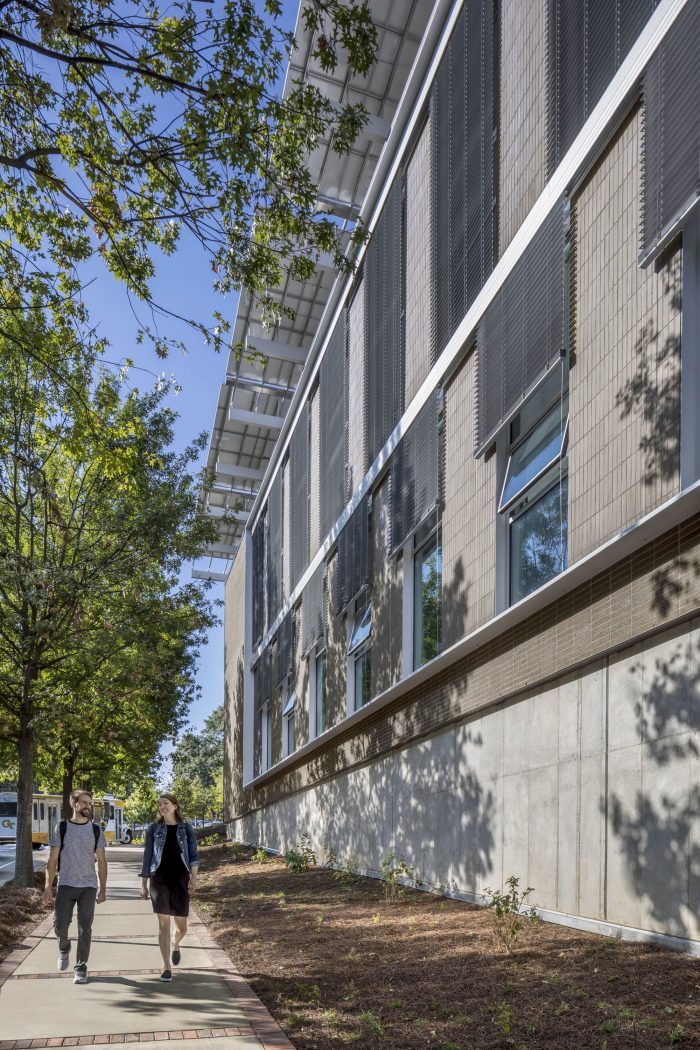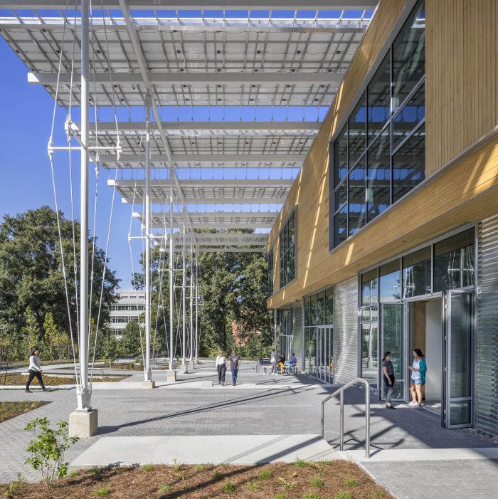 The design is inspired by the vernacular southern porch. The project reimagines this regionally ubiquitous architectural device for the civic scale of the campus. The Regenerative Porch performs the traditional tasks of creating a cool microclimate around the building and blurring interior and exterior conditions. Additionally, the Porch is leveraged to satisfy the rigorous requirements of the Living Building Challenge. The PV canopy generates more than 100% of the building’s energy demand and captures enough rainwater to meet 100% of the water used in the building.