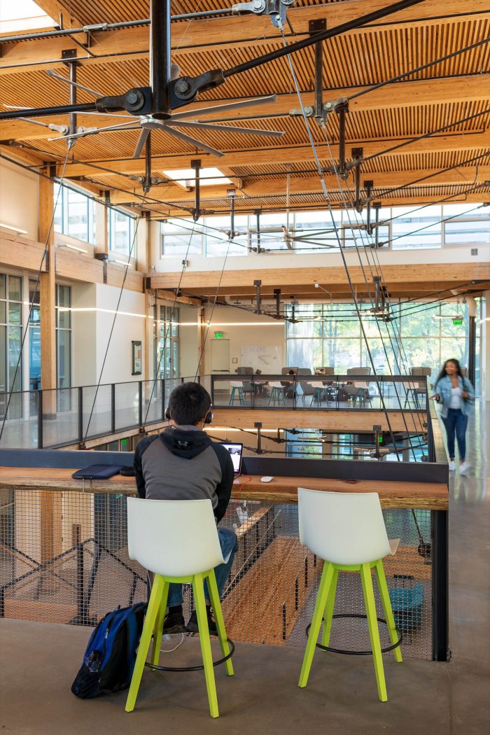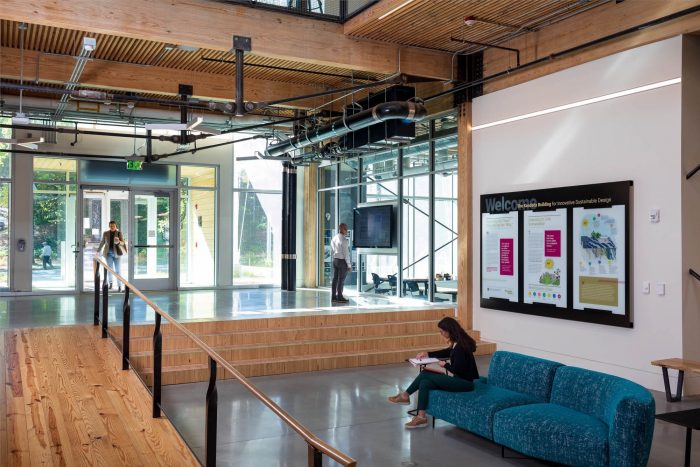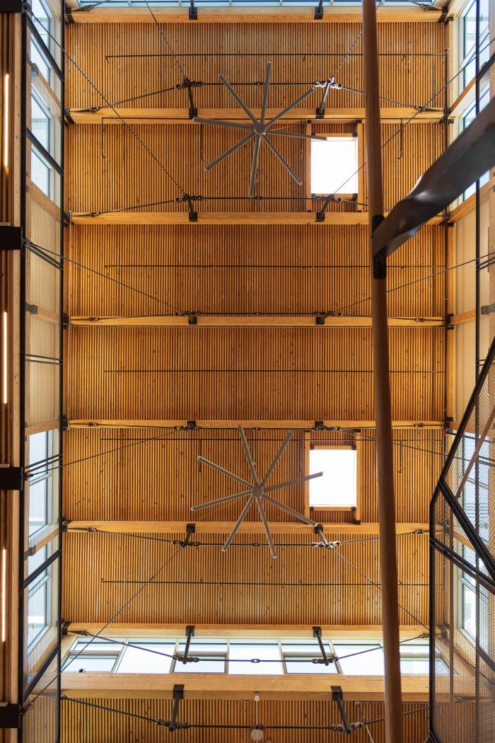 The Kendeda Building is the university’s first timber building since its earliest load-bearing masonry and timber structures from the 1880s. Mass timber was selected for its significantly smaller embodied carbon footprint, compared to concrete and steel systems. Glue laminated queen-post trusses with steel bottom chords are used to achieve the spans required by the larger spaces in the building where timber alone would be challenging. This hybrid approach reduces the quantity of wood required while making the routing of building services more efficient. The gravity and lateral elements are fully exposed, allowing the building to be a teaching tool and defining the character of the interior environment. The nail laminated wood decking was panelized off-site and craned into place.