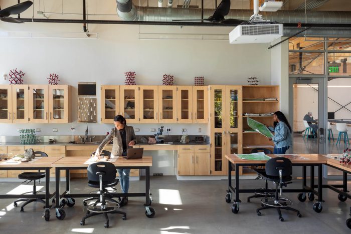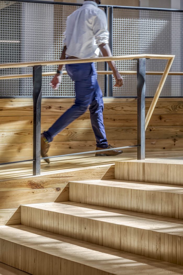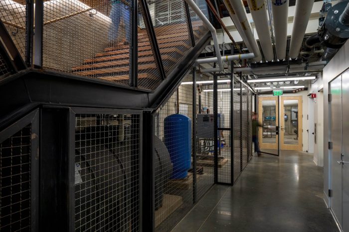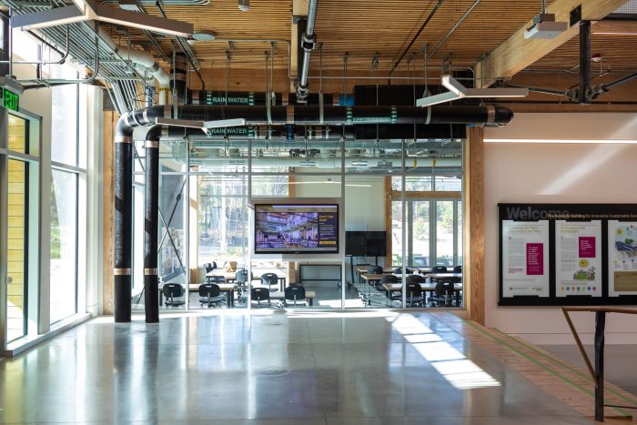 Twenty-five thousand linear feet of 2-by-4 material was salvaged from Atlanta’s Lifecycle Building Center, which sourced the lumber from discarded film sets. The decking was assembled by apprentices hired through local nonprofit Georgia Works!, providing valuable trade skills. Off-cuts from the new lumber were assembled into the seat steps that descend the three tiers of the atrium. In addition to the structural timber, wood salvaged from storm-felled trees on campus and in southern Georgia was used for countertops and furniture. All of the water used in The Kendeda Building comes from rainwater captured by the PV canopy.
