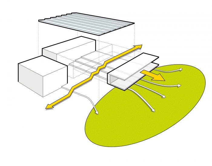 该设计的灵感来自于当地的南方门廊。该项目为校园的公民规模重新设想了这一地区普遍存在的建筑装置。再生门廊履行了传统的任务,即在建筑周围创造一个凉爽的小气候,并模糊了内部和外部条件。此外,门廊被用来满足 "生活建筑挑战 "的严格要求。光伏天幕产生的能量超过了建筑的100%需求,并收集了足够的雨水来满足建筑中100%的用水。